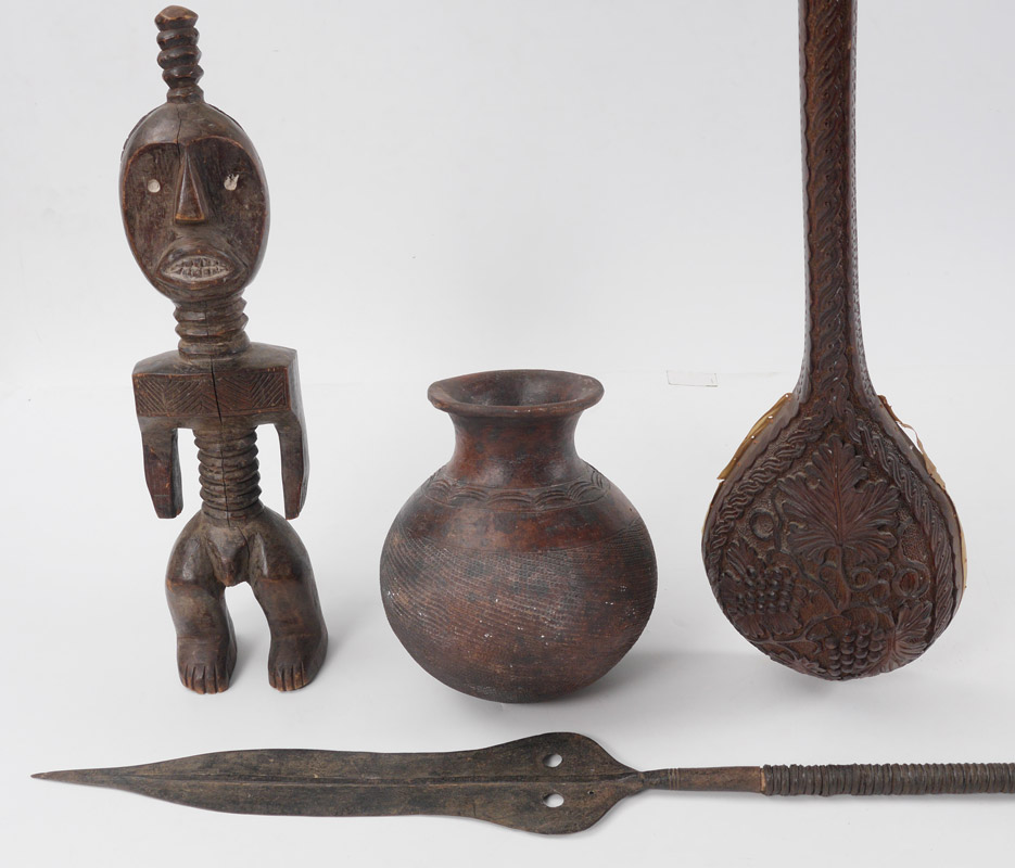 4 PIECE COLLECTION OF AFRICAN TREASURES: 4 pieces total to include 1) Carved Lulua or Ndengese standing male figure, 21 1/2'' h. x 5'' x 5''. 2) Kuba scratch earthenware pot, 10'' h. x 8 1/2''. 3) Large carved spoon with skin cover, carved antelope handle, 33 3/4'' long. 4) Spear with metal clad shaft, iron blade point, 68 1/2'' long.