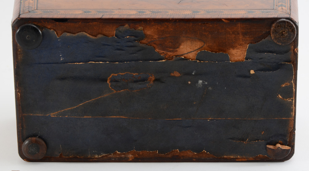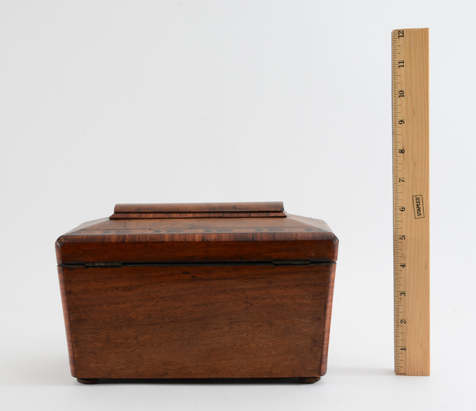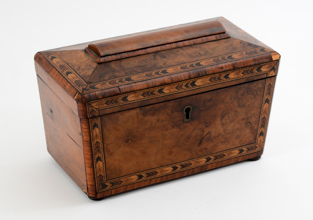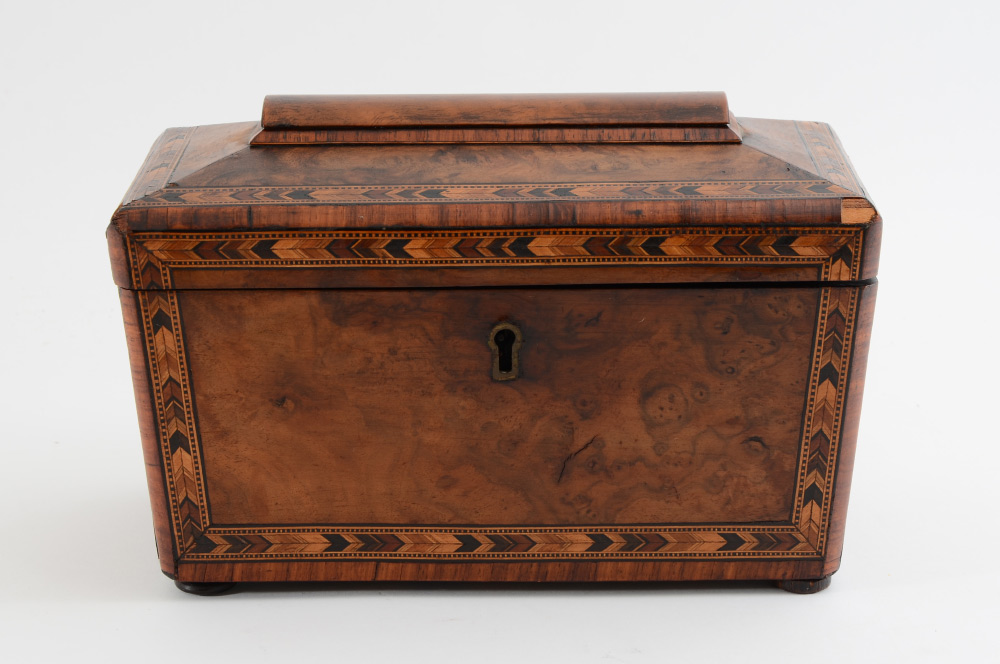 GEORGIAN INLAID BURL WOOD TEA CADDY: Sarcophagus shape tea caddy with hinged lid, burl veneer with parquetry inlaid bands. 2 lidded interior compartments, all on 4 bun feet. Overall measures 6 1/4'' h. x 9 3/4'' x 5 1/4''.