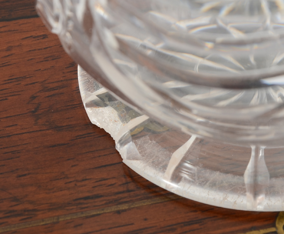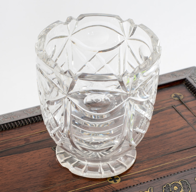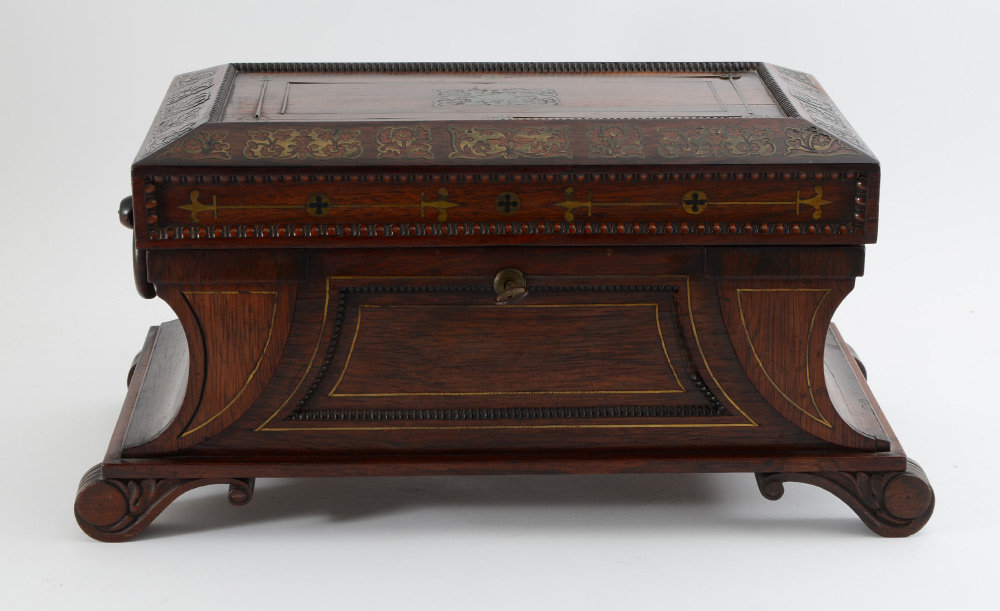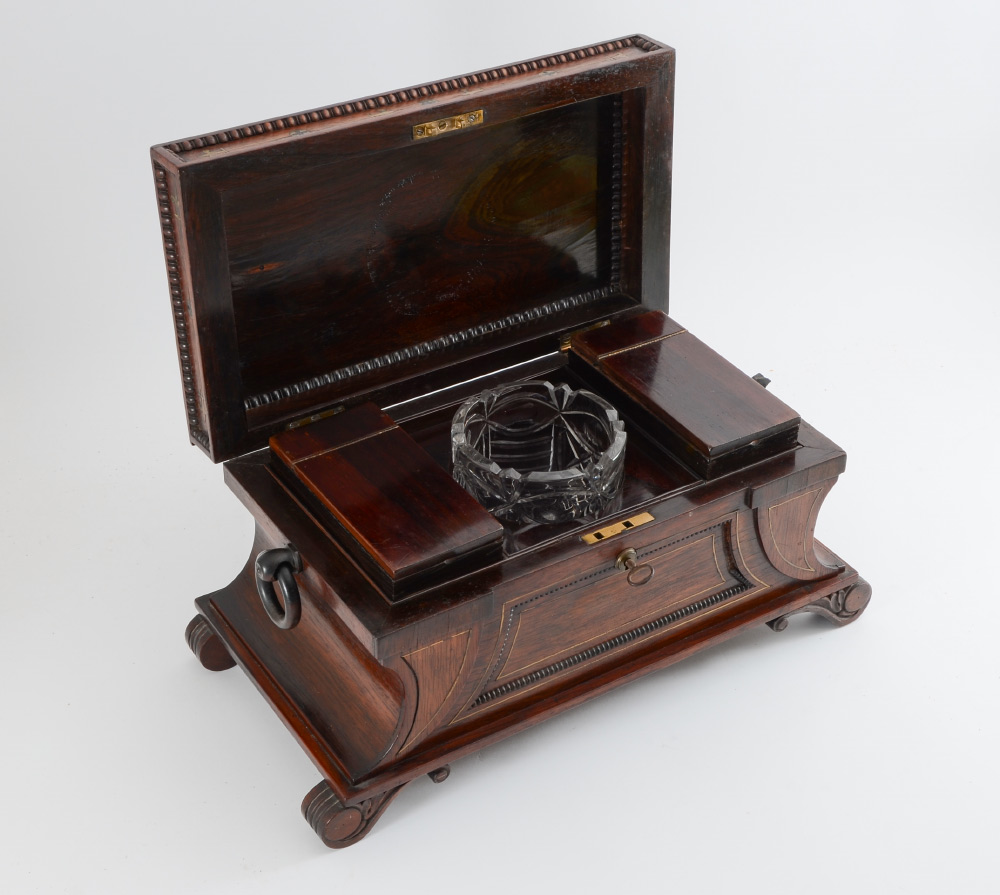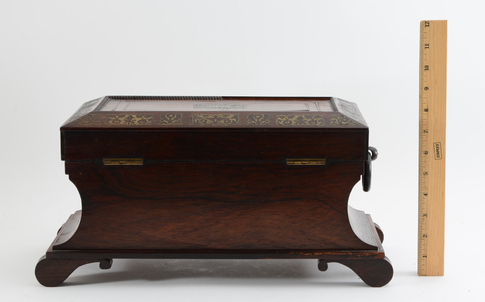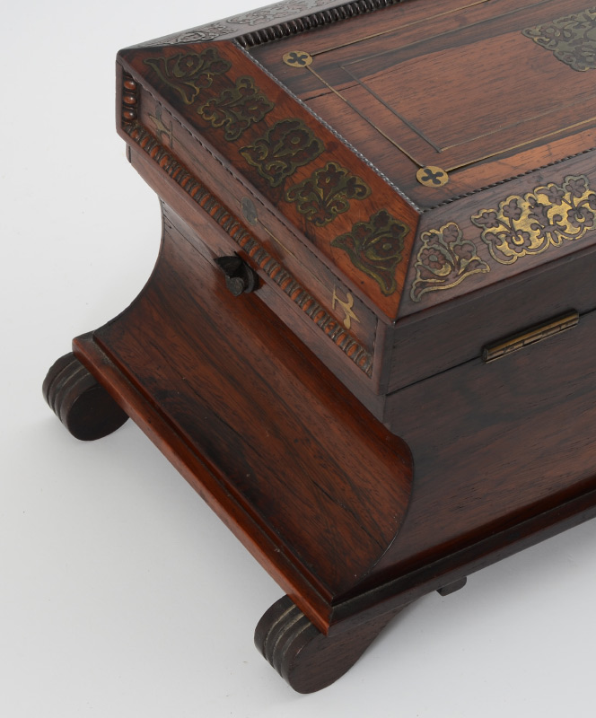 REGENCY PERIOD BOULLE INLAY TEA CADDY: Hinged lid with stylized floral boulle brass inlay, gadroon metal and carved egg and dart trim pieces. Shaped body with concave sides, carved feet. Interior with 2 compartments, central cut glass vessel. Overall measures 8'' h. x 16 3/4'' x 8''.