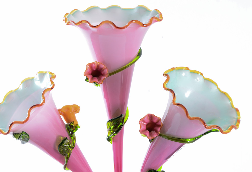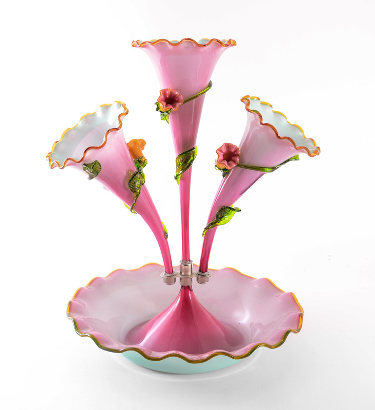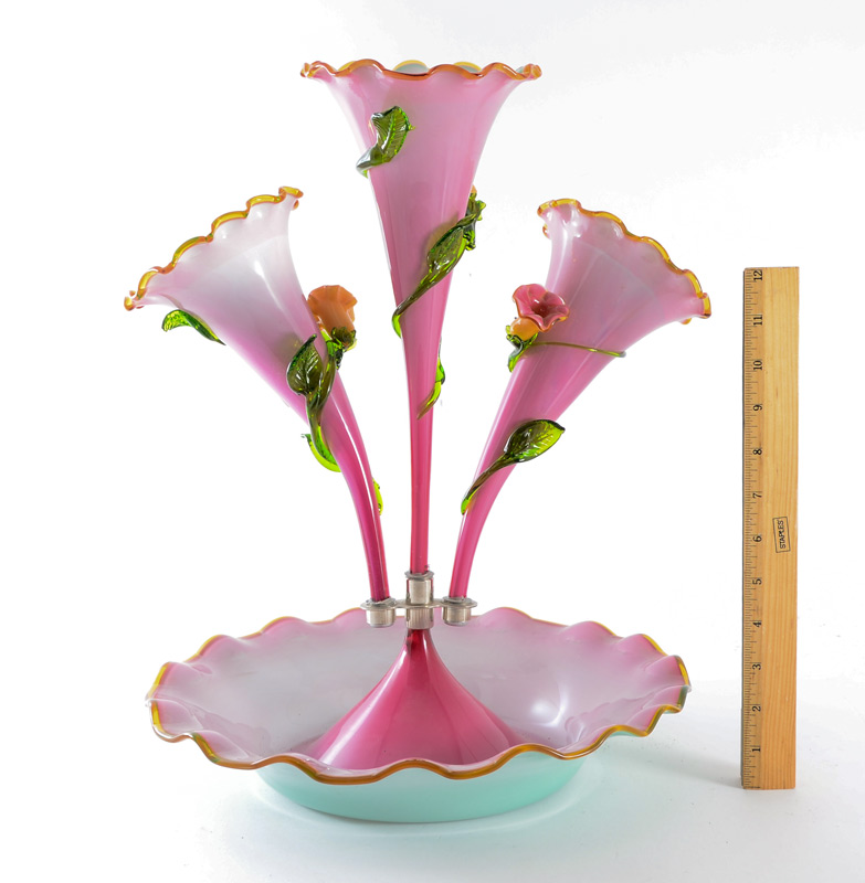 FINE VICTORIAN ART GLASS EPERGNE WITH APPLIED FLOWERS: Attributed to Stevens and Williams, 3 pink glass horns with ruffled amber rims and applied flowers. Ruffled cased base with pink interior, green exterior, amber rim. Overall measures 16 3/4'' h. x 14 1/4'', base alone 5'' x 13 1/4''.
