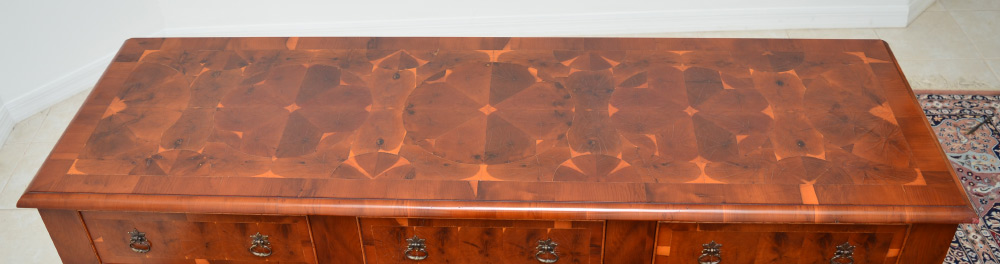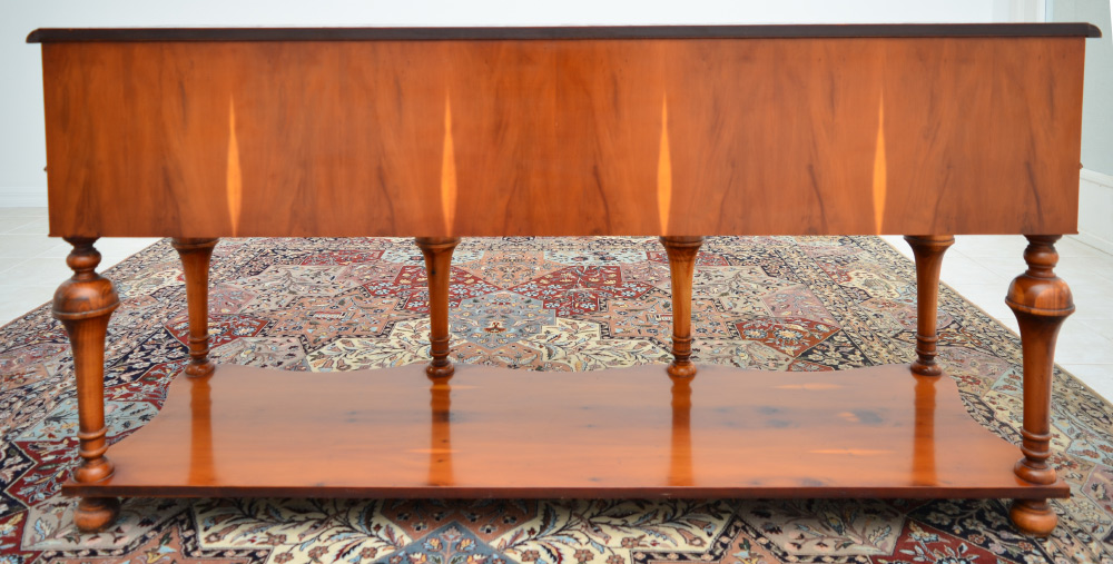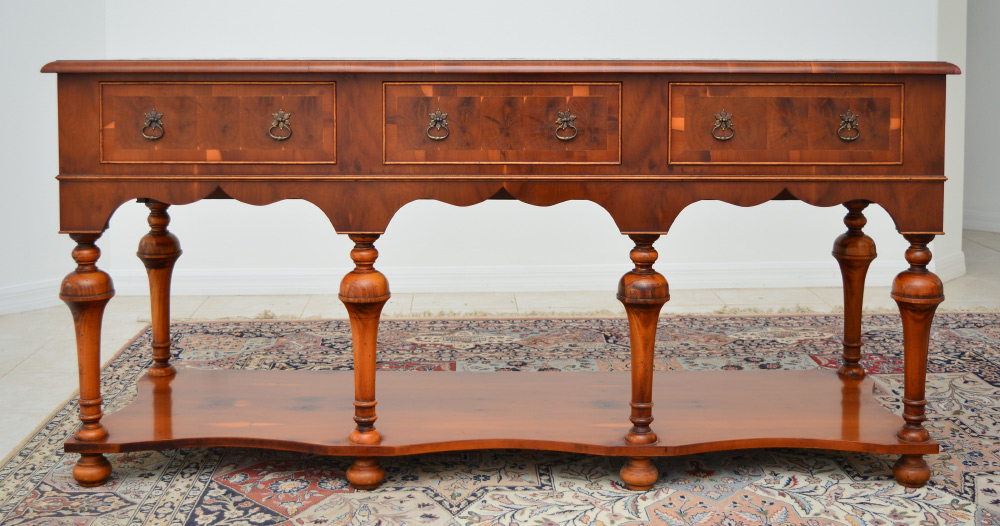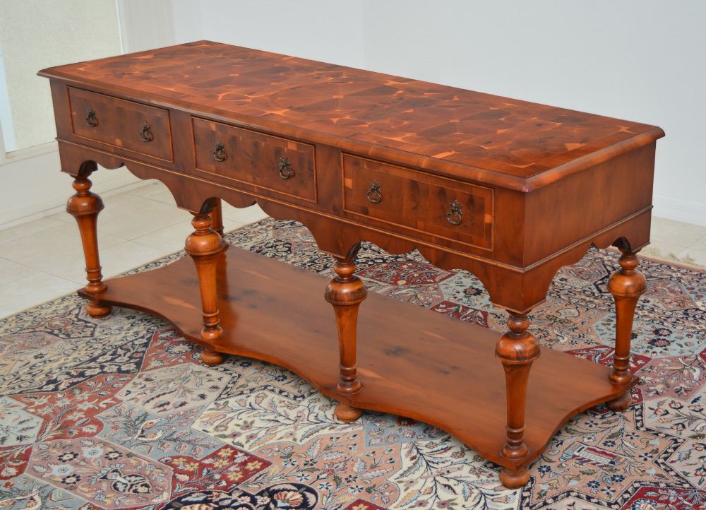 AFRICAN YEW WOOD SIDEBOARD: Parquetry inlaid top and 3 drawer fronts, galleried skirt, turned legs, shaped open lower shelf, all on bun feet. 32'' h. x 65 1/2'' x 21 1/4''.