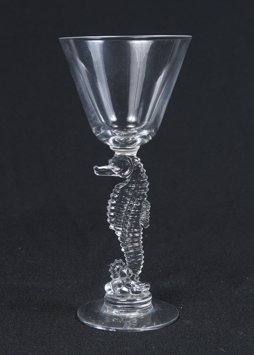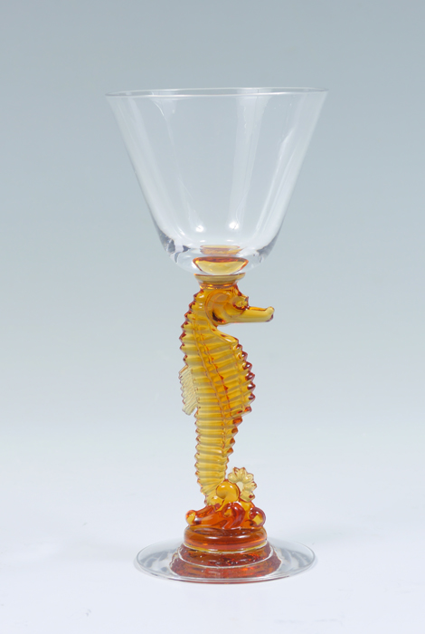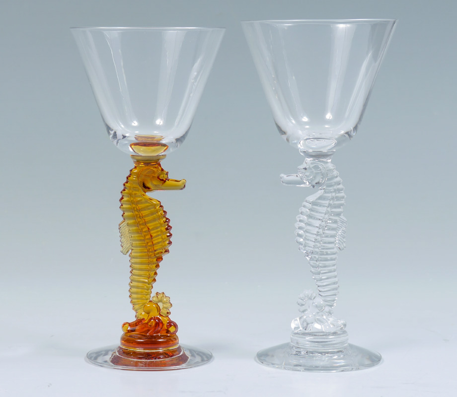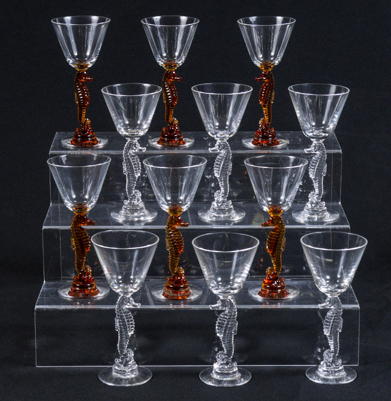 12 HEISEY SEAHORSE COCKTAIL GLASSES: Figural seahorse stems 6 amber, 6 clear. Signed with H in diamond. Approx. 6 7/8''h.