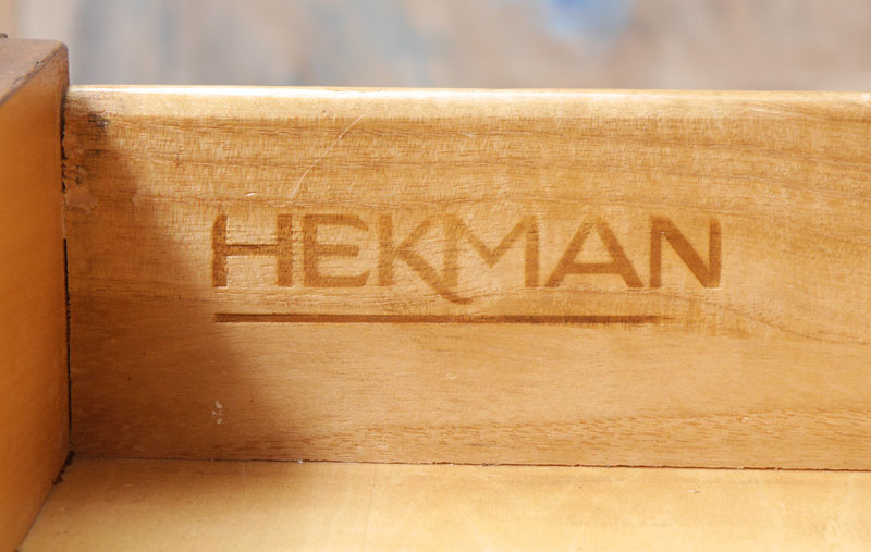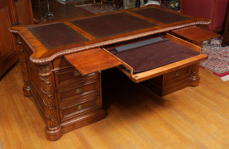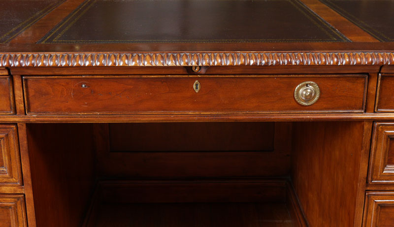 HEKMAN LEATHER TOP EXECUTIVE DESK: Shaped top with cookie corners, inset embossed leather panels and carved gadroon trim. Central drawer, either side with 2 shallow drawers over deep file drawer, carved and fluted column stiles. Overall measures 30 1/2'' h. x 74'' x 39''.