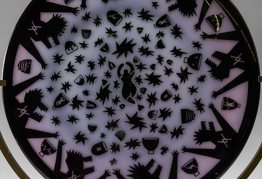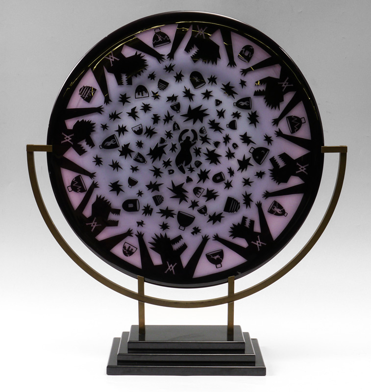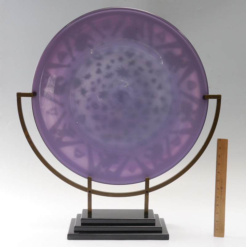 McCLELLAN, DUNCAN, (American 1955-): Overlay carved glass charger by St. Petersburg treasure Duncan McClellan. Charger approx. 21 1/2'' dia, 3 pieces including stand overall 27'' h.