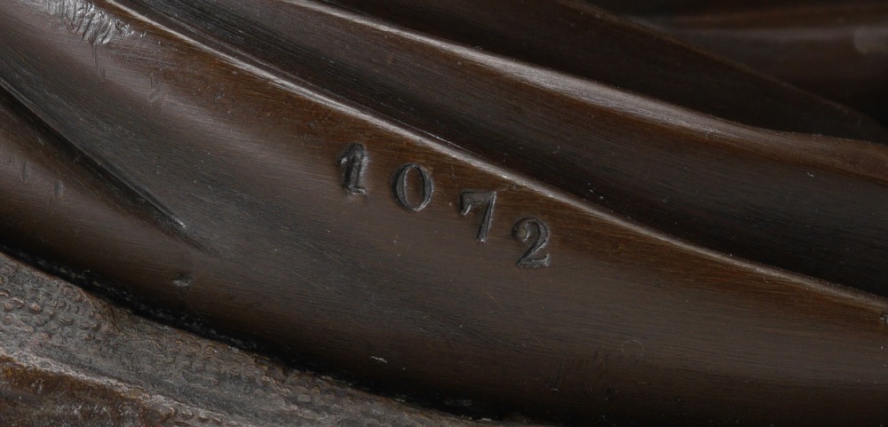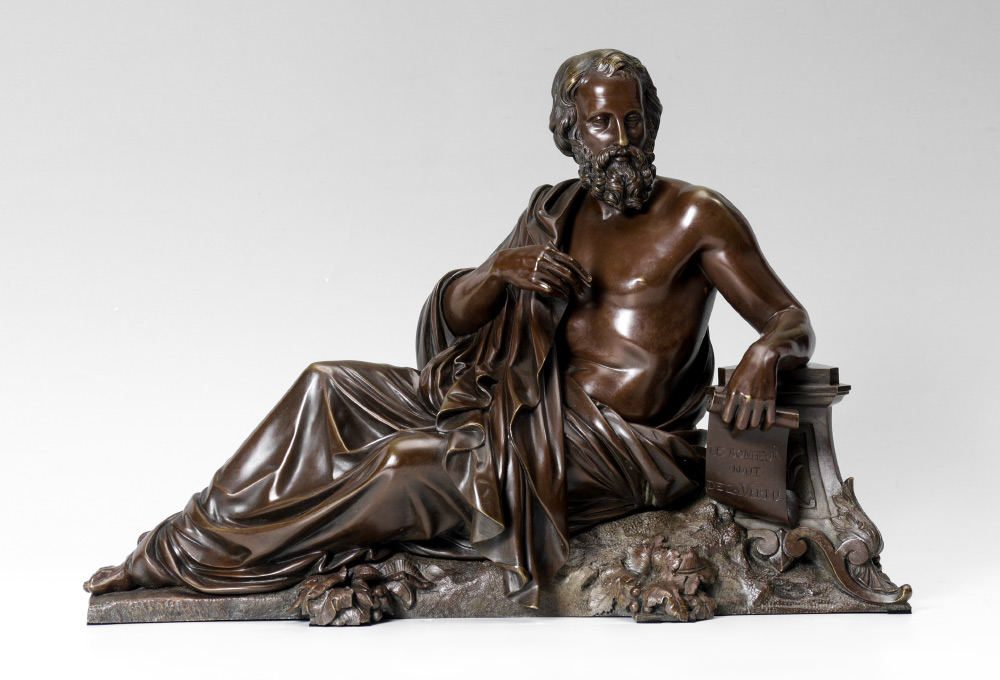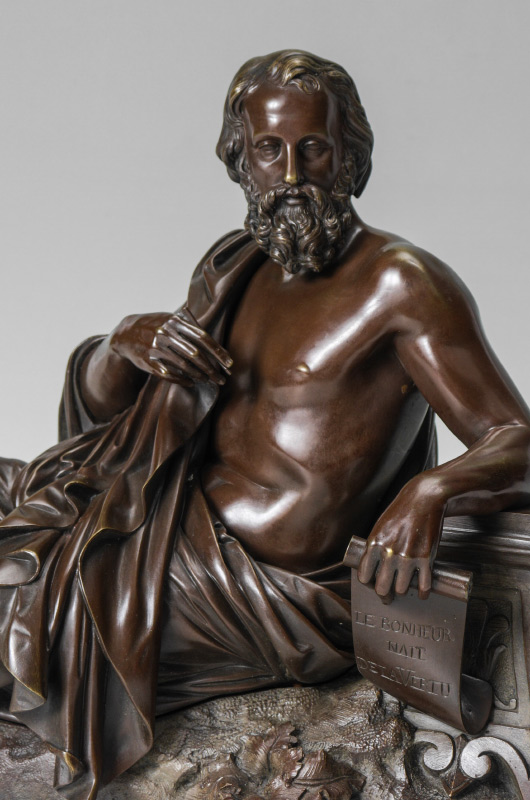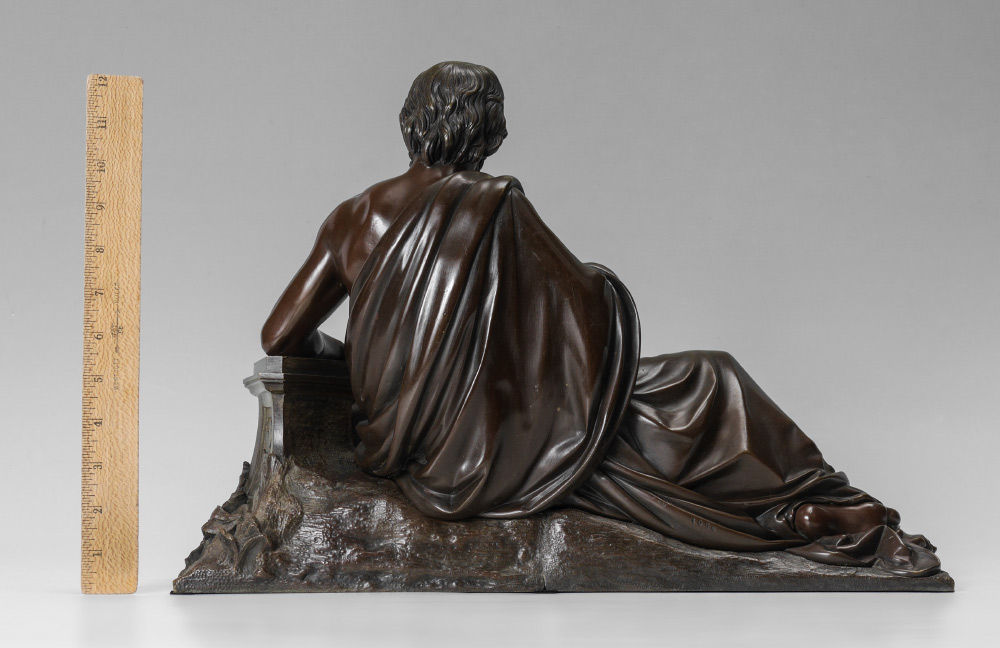 BRONZE RECLINING PHILOSOPHER: Philosopher, Bronze, finely modeled with a long beard, draped in a flowing robe, a scroll to his left hand engraved 'Le Bonheur Nait de la Vertu' (Happiness comes from Virtue), 12 1/2'' x 18'' x 6''.