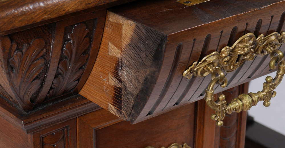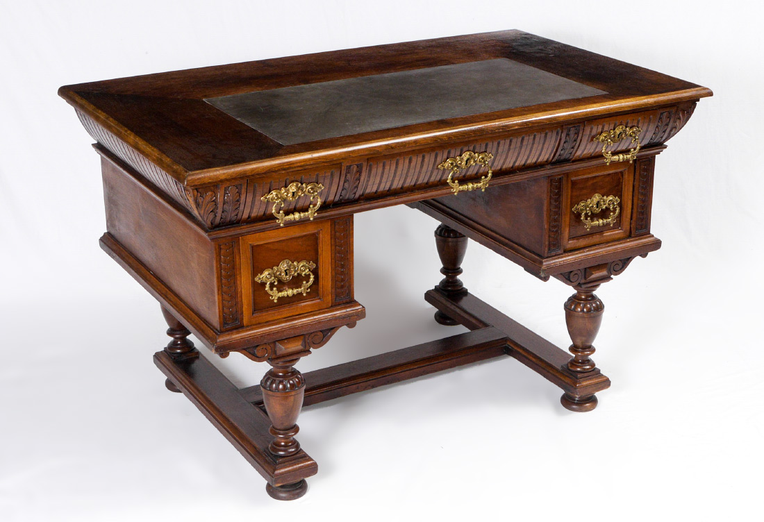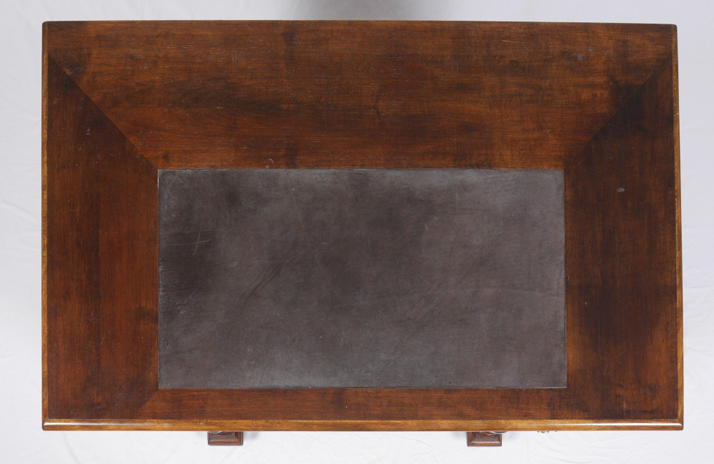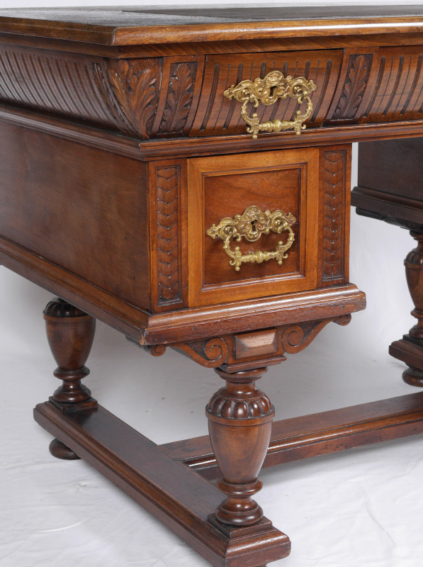 GENERAL TOMMY FRANKS GERMAN WALNUT WRITING DESK: Owned and used by General Tommy Franks, carved legs and drawer fronts. Dovetail construction, three drawers across top, 2 knee hole side drawers. One lock signed ''Fr. Semilsky''. 30'' h. x 49'' x 30'' .