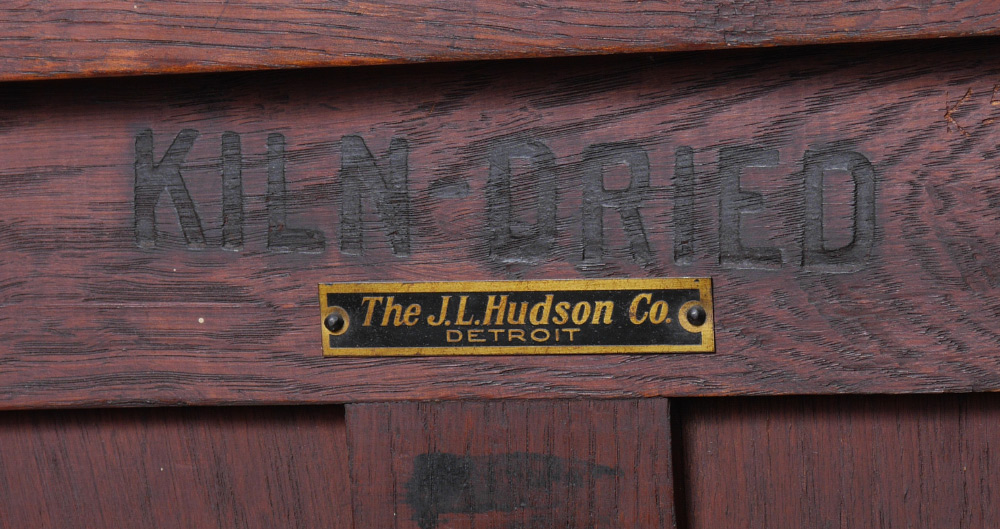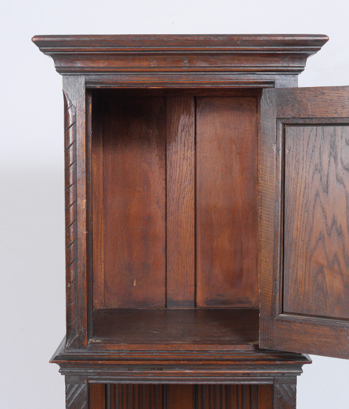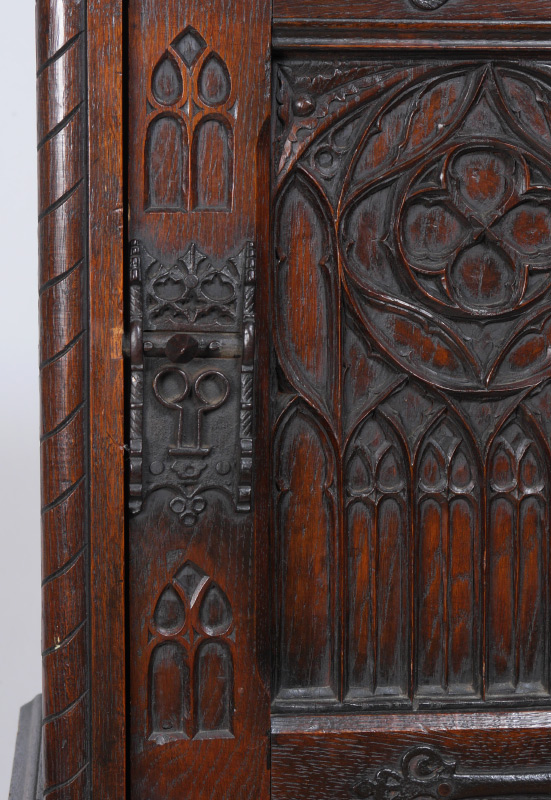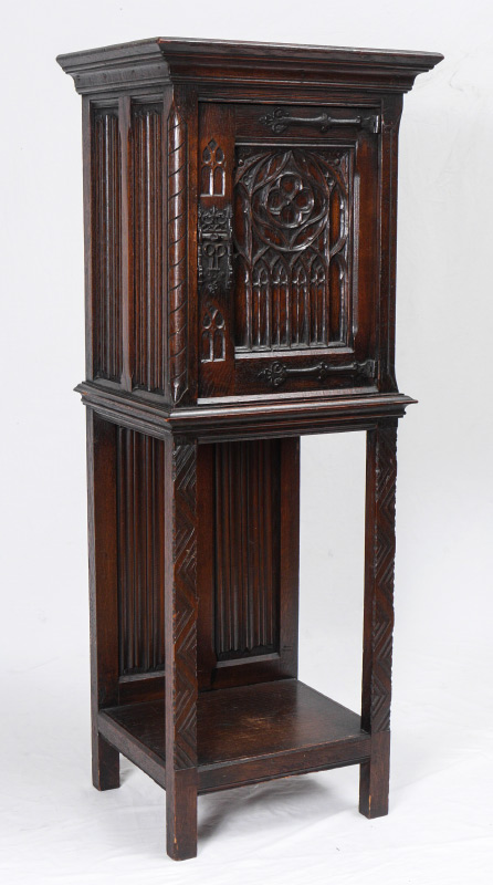 BELGIAN CARVED OAK RECTORY OR SIDE CABINET: Single door cabinet with overhanging molding, deeply carved door and linen fold carvings on the sides and the back of the lower tier. Iron Strap hinges. Sold by J. L. Hudson Co. New York. Stamped ''Made in Belgium Kiln Dried''. 50'' high x 19'' wide x 16'' deep