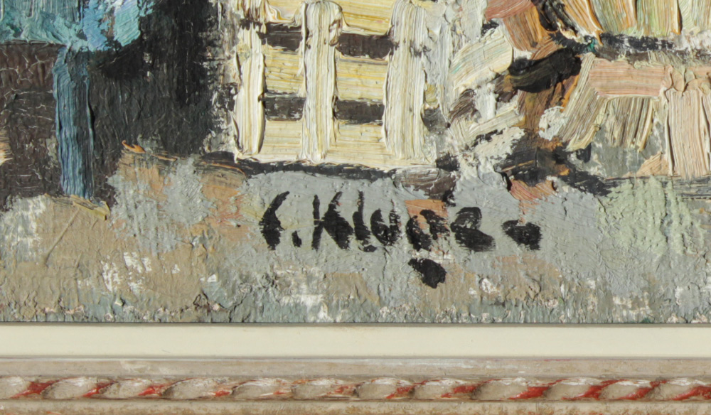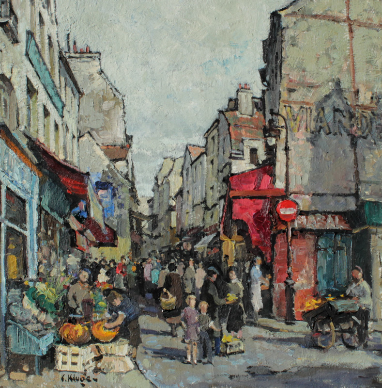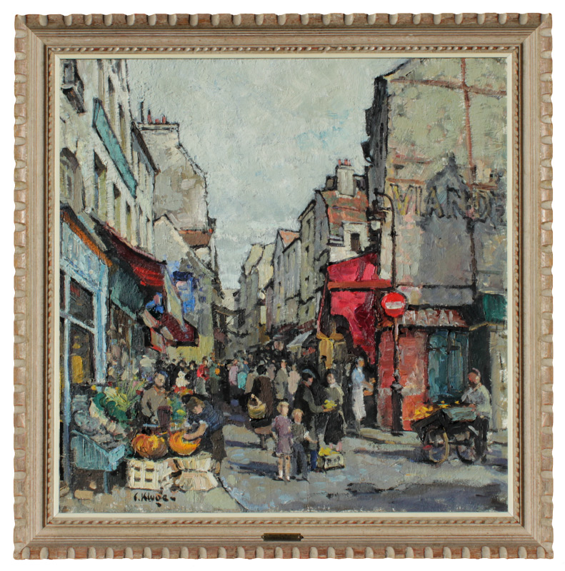 KLUGE, Constantine, (Russian/French, 1912-2003): ''Le March Rue Mouffetard'', Parisian street scene, 29'' x 28 1/2'', signed lower right, gilt carved frame, carved frame 33 1/2'' x 33 1/2''. Purchased Findlay Gallery, 1963.