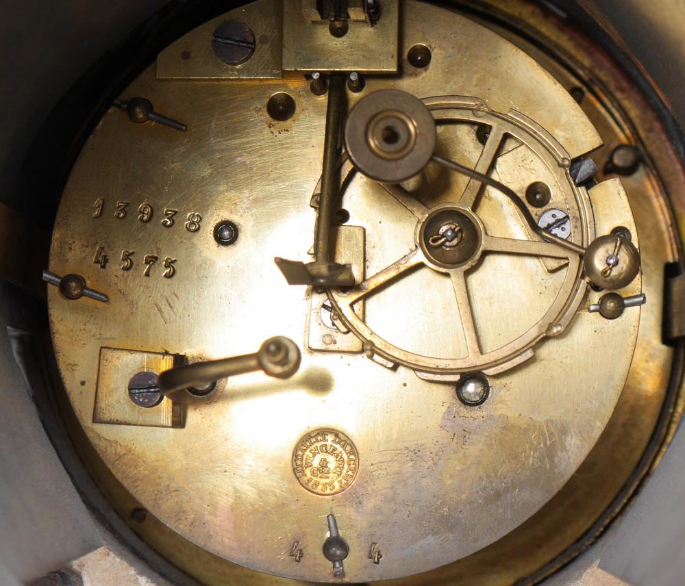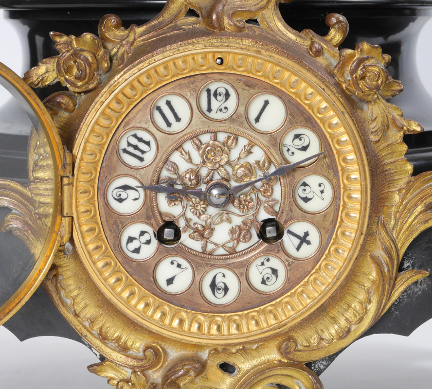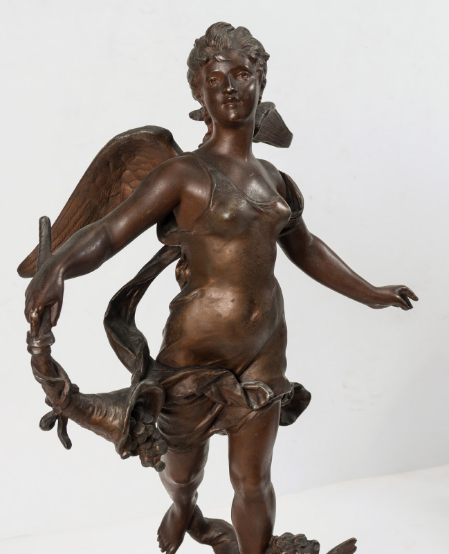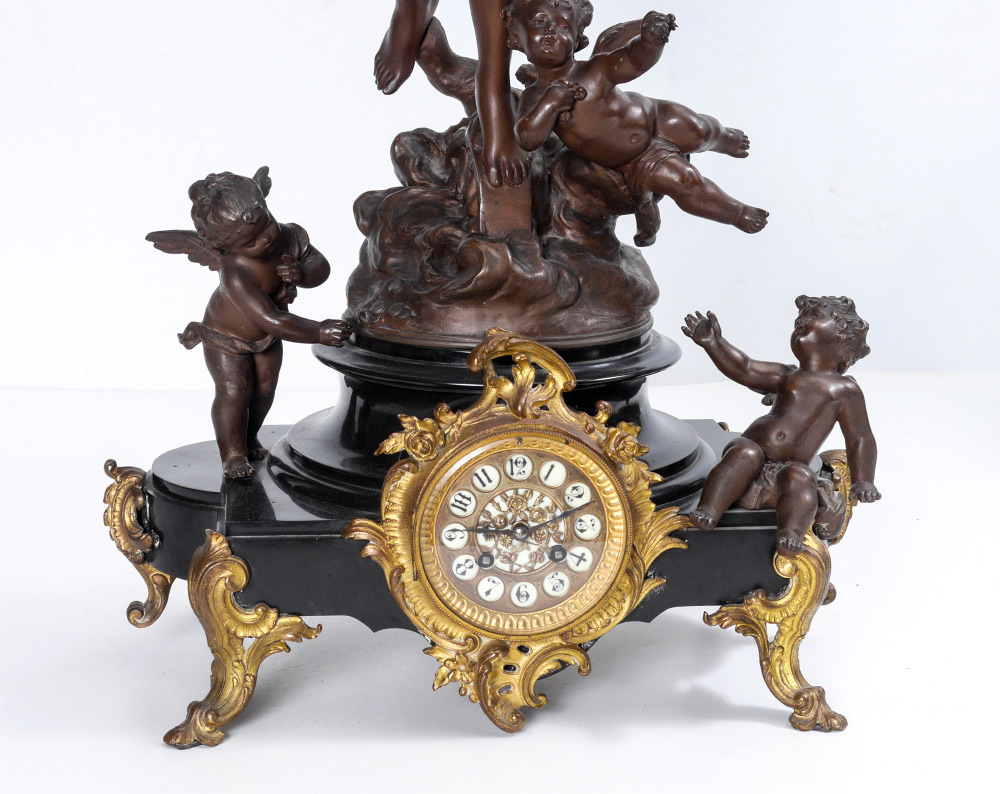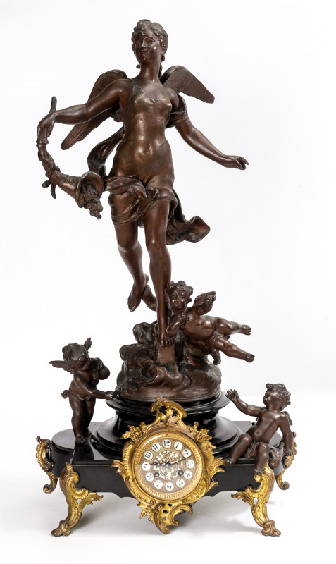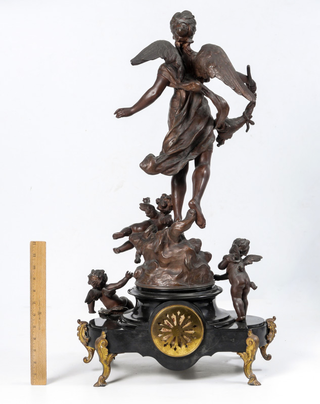 VINCENT D' ARGENT FIGURAL MAIDEN & CHERUBS CLOCK: Auguste Moreau bronzed metal figural maiden with cherubs sculpture signed at base. Marked with Vincent D' Argent Paris on key & pendulum mechanism. Measures 31 1/2''h