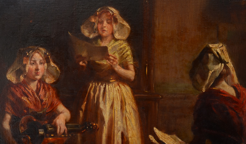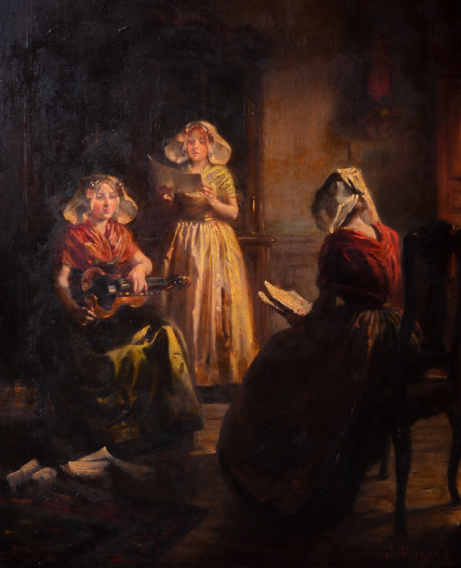 HUGARD, Claude Sebastien, (French, 1818-1886): Practice for the Recital, Oil/Canvas, 39 1/2'' x 32'', signed lower right, encased in elaborate gilded and pierce carved shell and foliate motif period frame, 50'' x 42'' x 5''. Old labels verso, purchased from Clarkes Art Rooms, from the former collection of Ms Emery. Old label with title ''Recreation du Dimanche en Zelaude''.