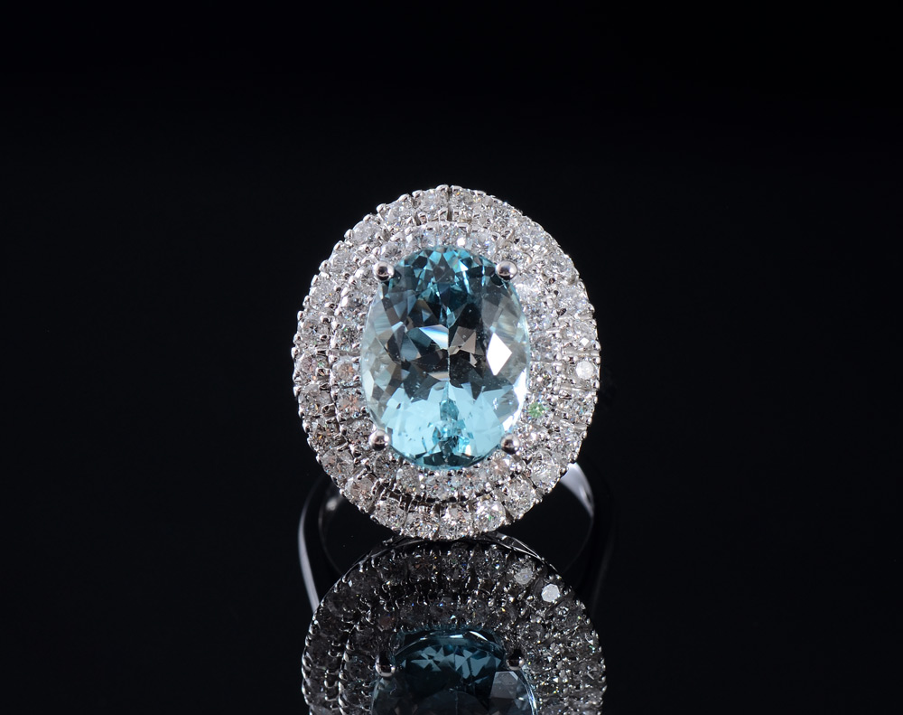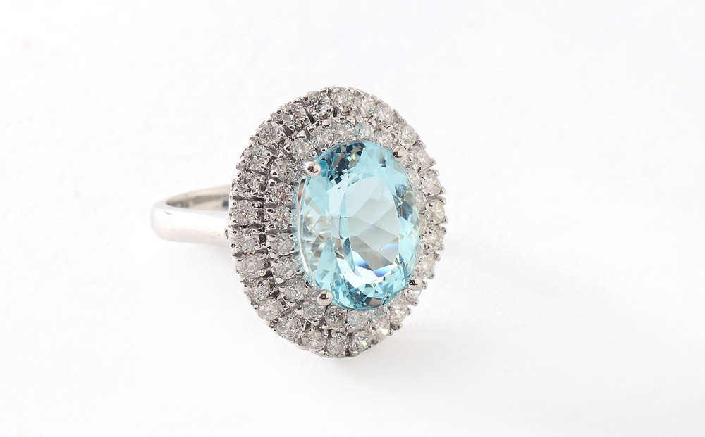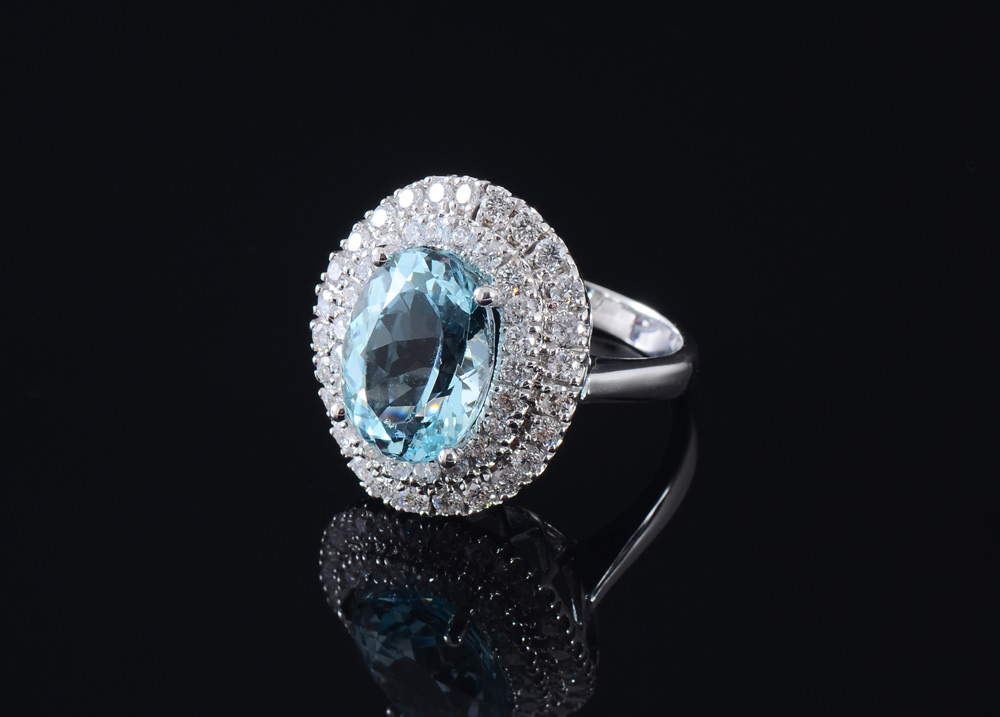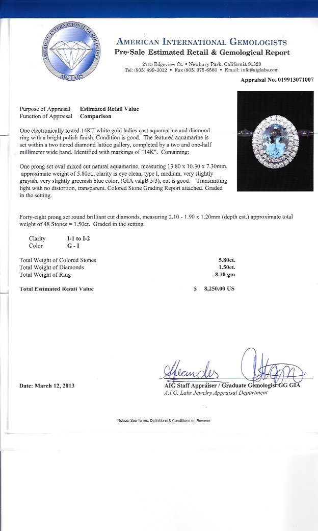 5.80 CT AQUAMARINE & DIAMOND RING: 14K white gold ring centering a 5.80 Ct natural oval mixed cut aquamarine, eye clean in clarity, framed by 48 round brilliant diamonds totaling approx. 1.50 Ct. of G-I color. Size 7. Weight 8.1 grams. Sold with 2013 A.I.G. GIA graduate gemologists written appraisal for $8,250.