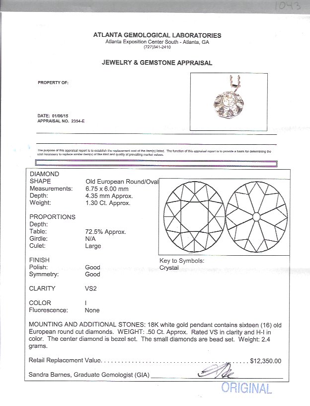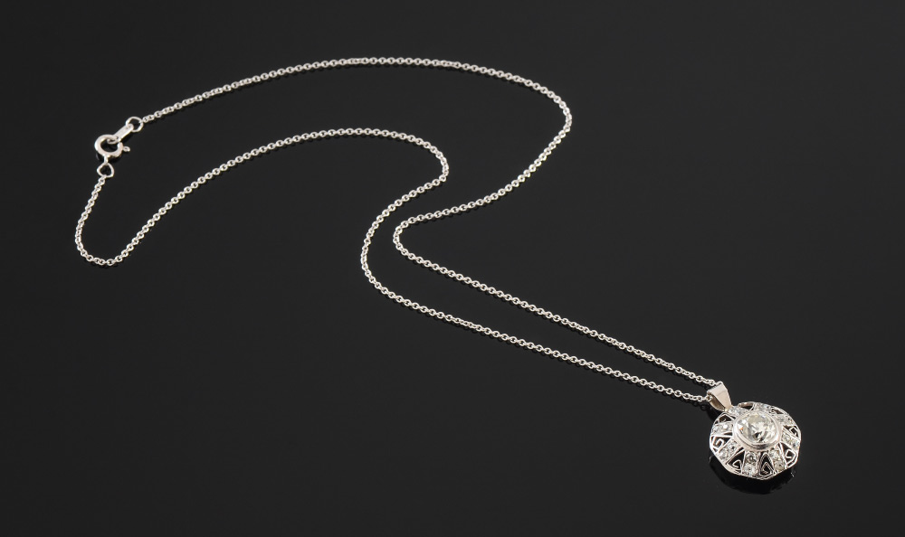 OLD EUROPEAN DIAMOND PENDANT NECKLACE: 18K white gold pendant centering an approx. 1.30 Ct Old European round cut diamond solitaire, VS2 clarity I color, with 16 accent diamonds totaling .50 Ct. Fine link chain, 16''. Sold with current Atlanta Gemological GIA graduate's appraisal for $12,350.
