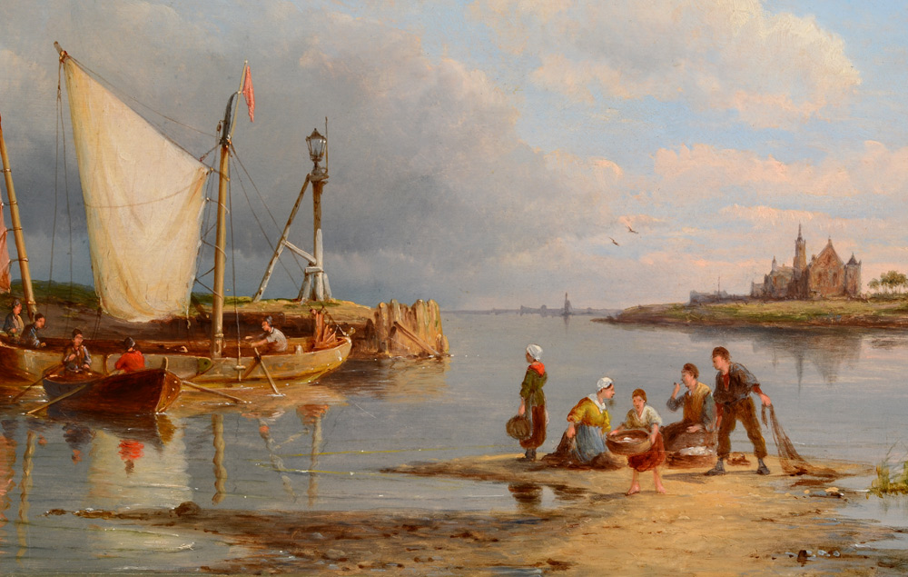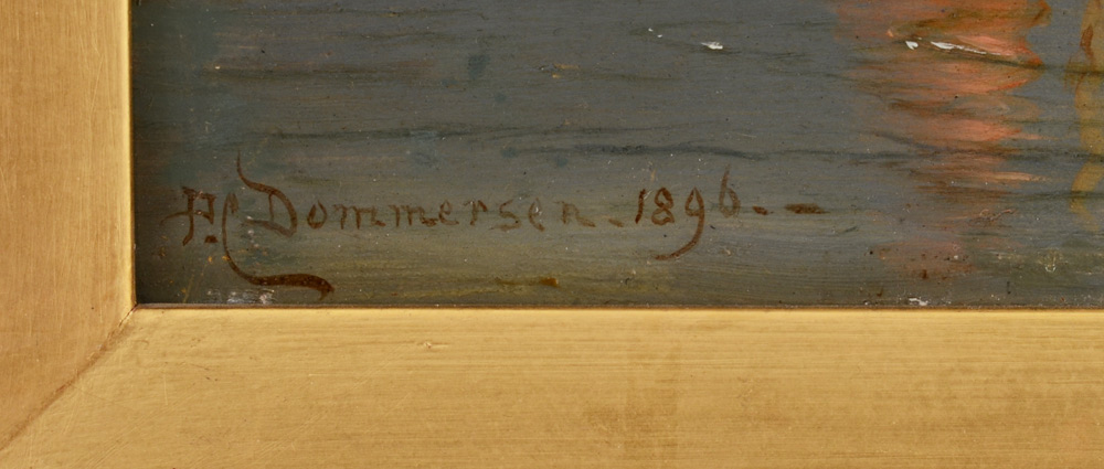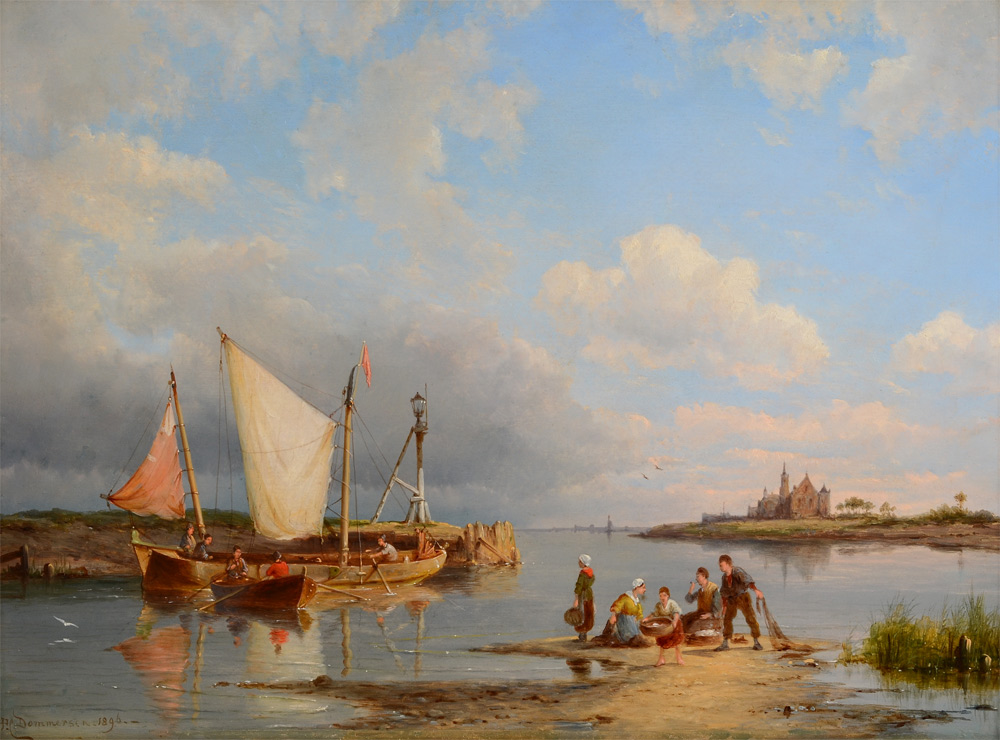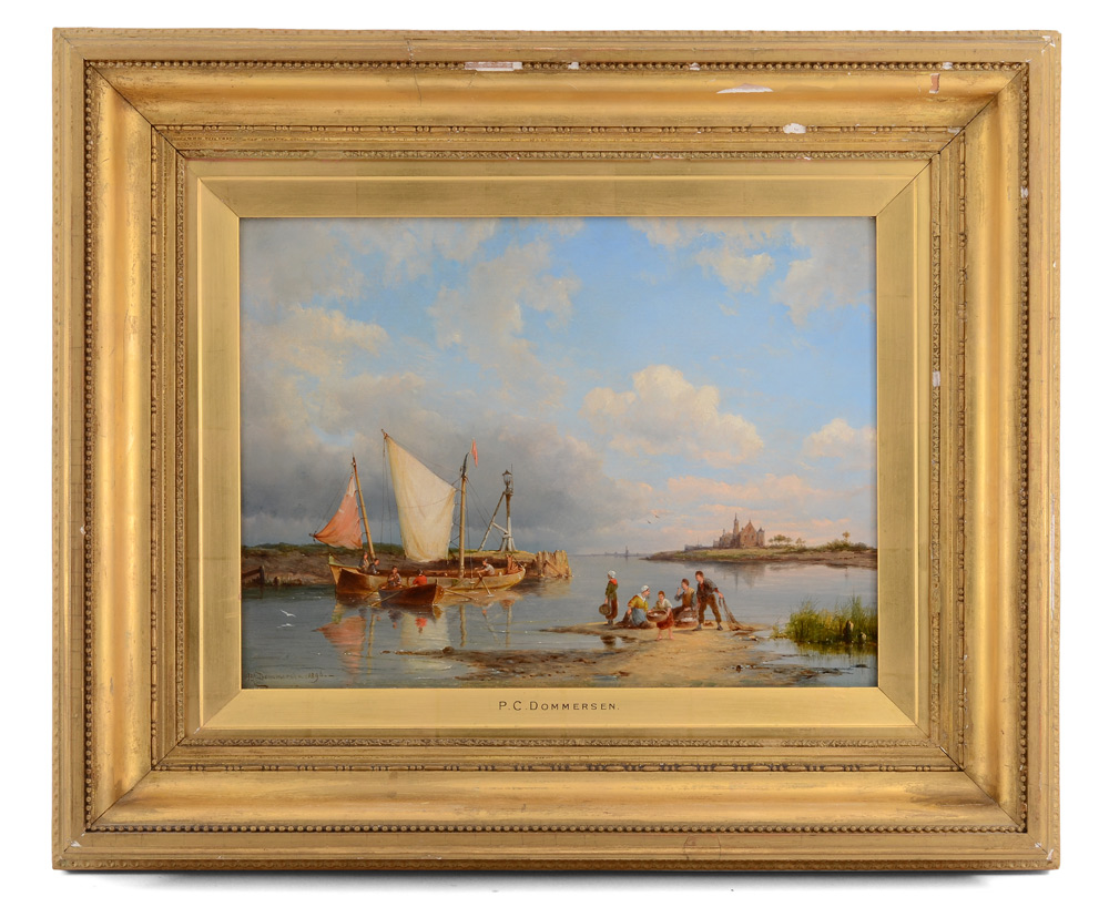 DOMMERSEN, Pieter Christian, Netherlands, (1865-1913): European Shoreline Inlet - unloading the fishing boat, Oil/Wood, 11 5/8'' x 15'', signed lower left and dated 1896, period gilded frame, 20 1/2'' x 24 1/2''.