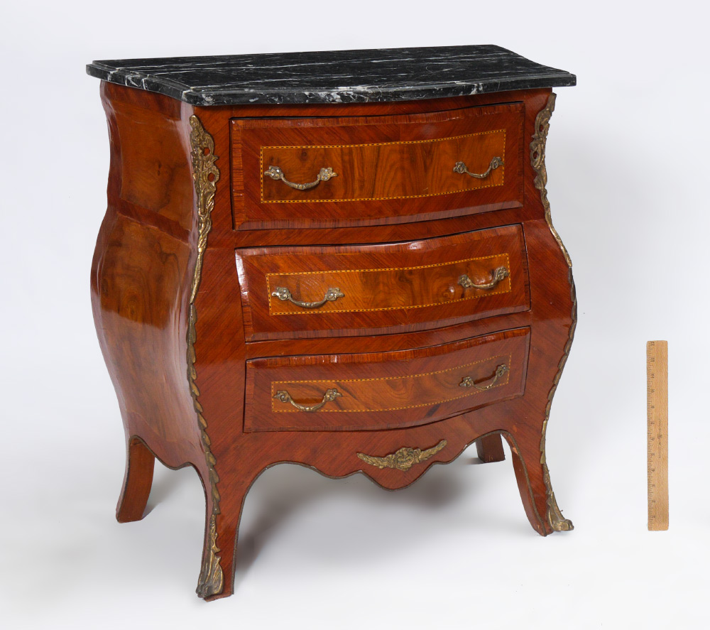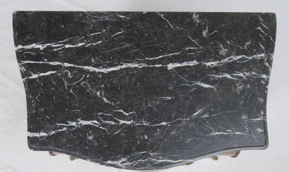 MARBLE TOP & ORMOLU COMMODE: Shaped black variegated marble top, 3 drawer bombe base with parquetry inlay and applied ormolu decoration and pulls. Overall measures 28 1/4'' h. x 26'' x 17''.