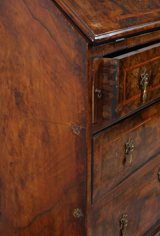 CONDITION: There is age splitting and veneer bubbling, especially to the fall front lid. It will need some cosmetic restoration.