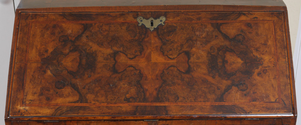 ENGLISH SLANT FRONT BUREAU DESK: Richly grained case with feather inlay. Bracket feet under three full length drawers. Interior desk fitted with drawers and pigeon holes. Measures 37 1/2'' high x 30 3/4'' wide x 19 1/2'' deep.