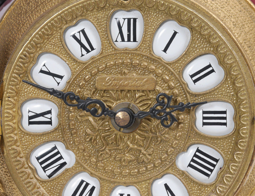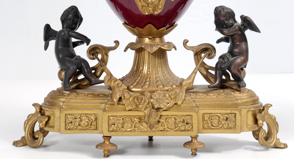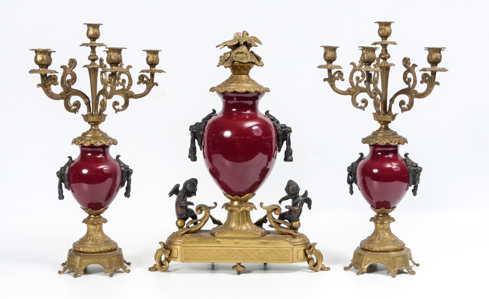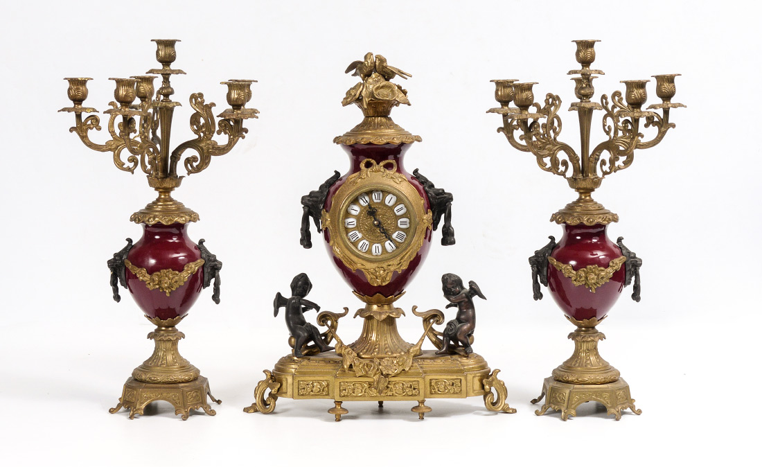 IMPERIAL FIGURAL CHERUB CLOCK GARNITURE SET: Contemporary garniture set by Imperial. Clock with red enamel metal case, patinated and gilt metal accents including birds, flowers, lion masquerons and putti. Dial marked Imperial and Made in Italy in cabochons with Roman numerals. Overall measures 20 1/2'' h. x 15 1/2'' x 4 3/4''. Sold with matching 6 light candelabra garniture, measures 21 1/4'' x 11 1/4''.