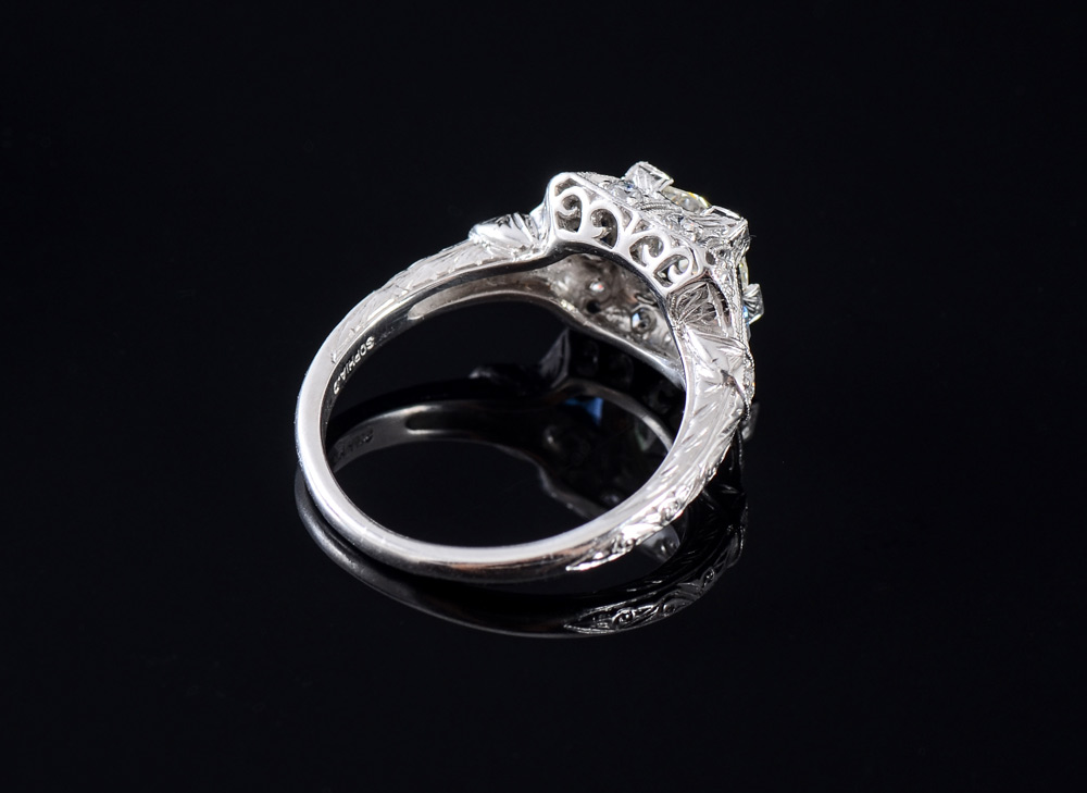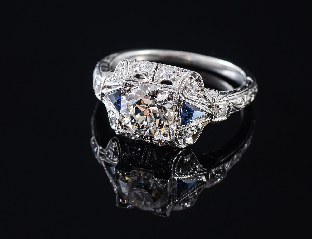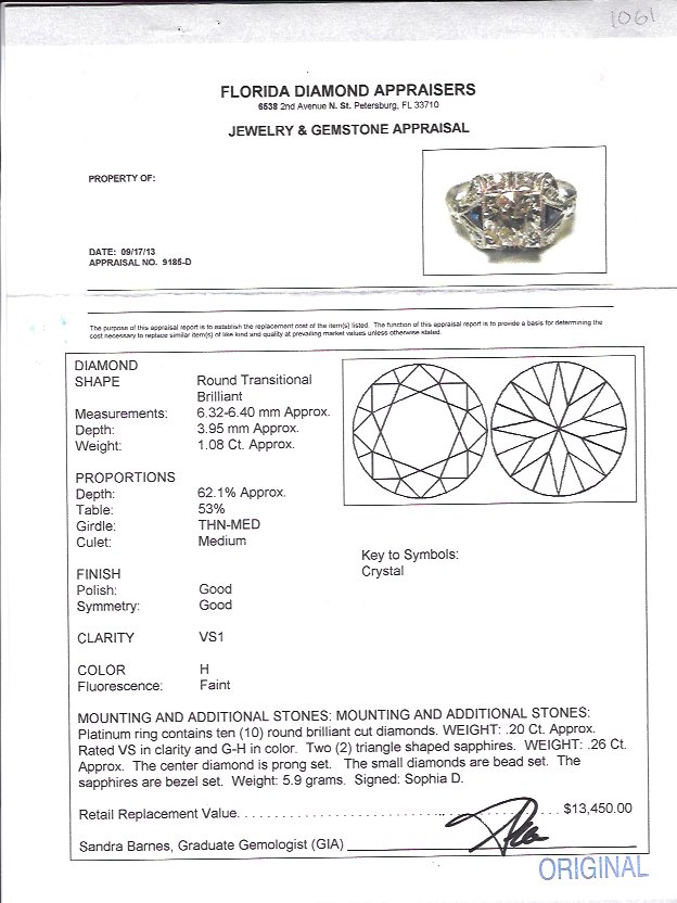 SIGNED SOPHIA D PLATINUM DIAMOND & SAPPHIRE RING: Art Deco styled platinum ring centers an approx. 1.08 Ct round transitional diamond of VS1 clarity and H color. At the sides are 2 triangle shaped sapphires. Approx. .26 Ct., and in the mounting there are an additional 10 round brilliant diamonds. .20 Ct. Size 6.5. Weight 5.9 grams. Sold with 2013 Florida Diamond Appraisers GIA graduates appraisal for $13,450.
