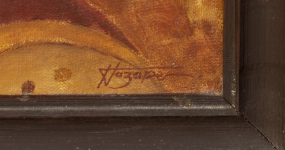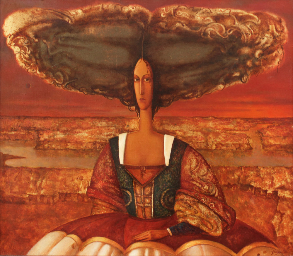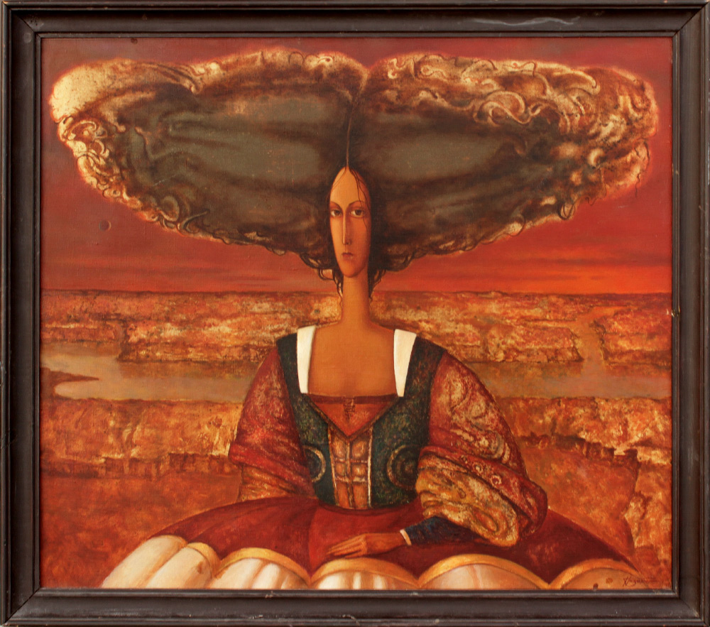 NAZARENKO RUSSIAN SURREAL PAINTING: Surreal Scene with young girl and pseudo-bouffant hair-do, with barren red landscape in the background, Oil/Canvas, 25 1/2'' x 29 1/2'', signed lower right, signed verso, framed, 28'' x 32''.