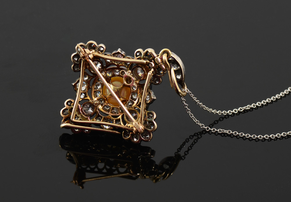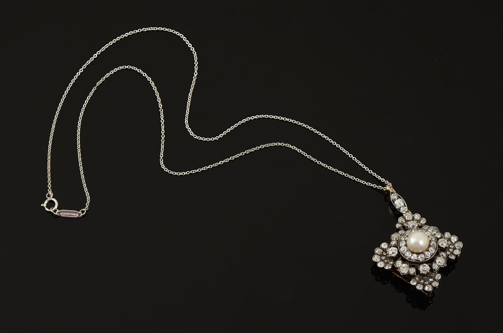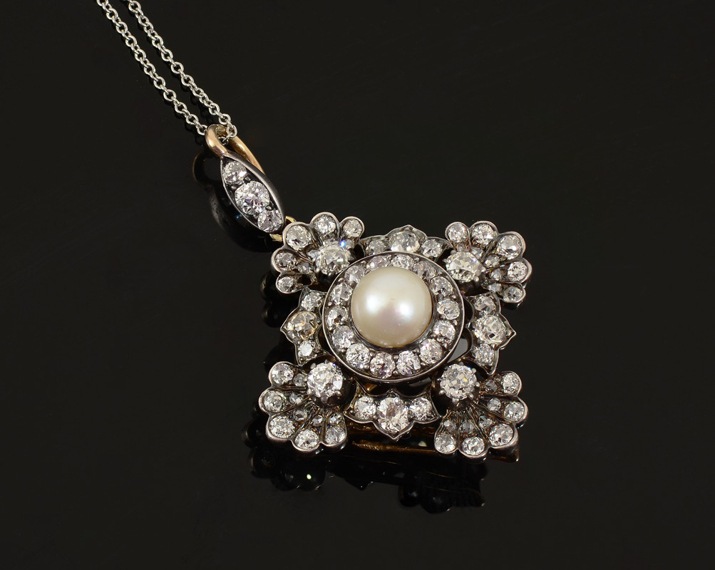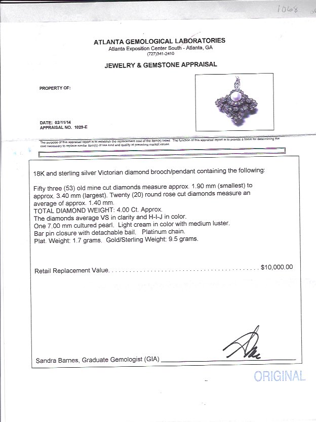 MUSEUM QUALITY GEORGIAN STYLE DIAMOND AND PEARL PENDANT / BROOCH: Ca. 1879. 18K white gold and sterling silver brooch pendant centering a 7 mm cultured pearl nestled above 53 old mine cut and 20 round rose cut diamonds totaling approx. 4.00 Ct. of VS clarity and H-I-J color. Bar pin closure with detachable bail. The 15.5'' platinum chain is later. Platinum weight 1.7 grams. Gold/Sterling weight 9.5 grams. Sold with 2014 Atlanta Gemological GIA graduate's appraisal for $10,000.