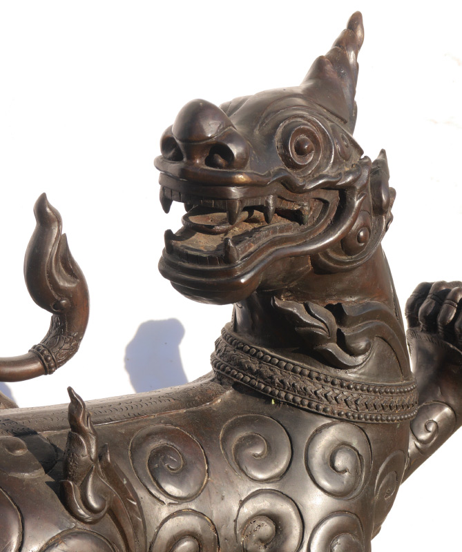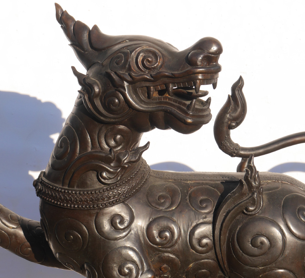PR CHINESE BRONZE MYTHICAL FOO CREATURES: Mated pair, female with left paw raised, male with right paw up. Contemporary casting, possibly unicorns or stylized lions. Overall measure 32'' h. x 34 1/2'' x 12''.
