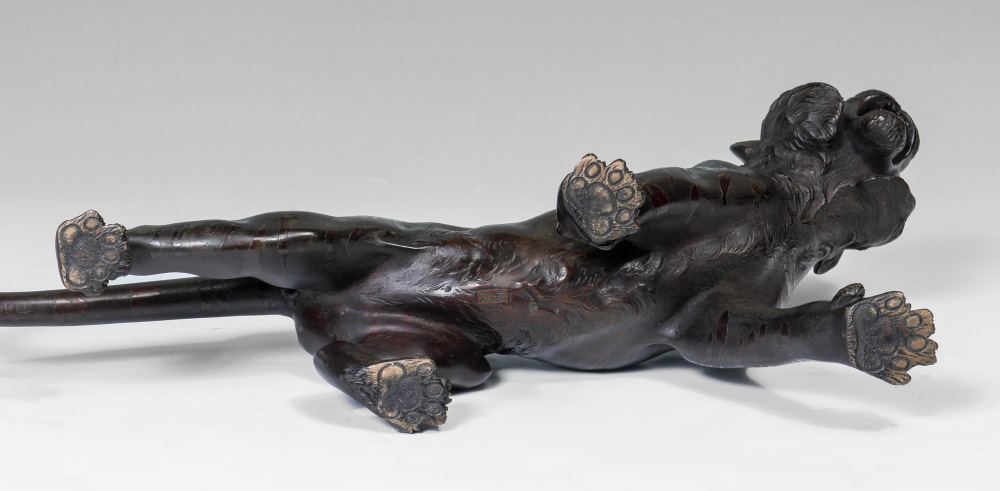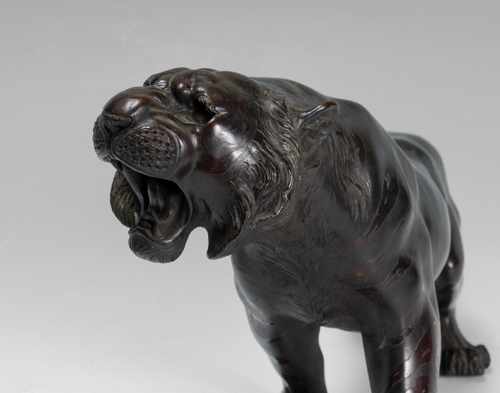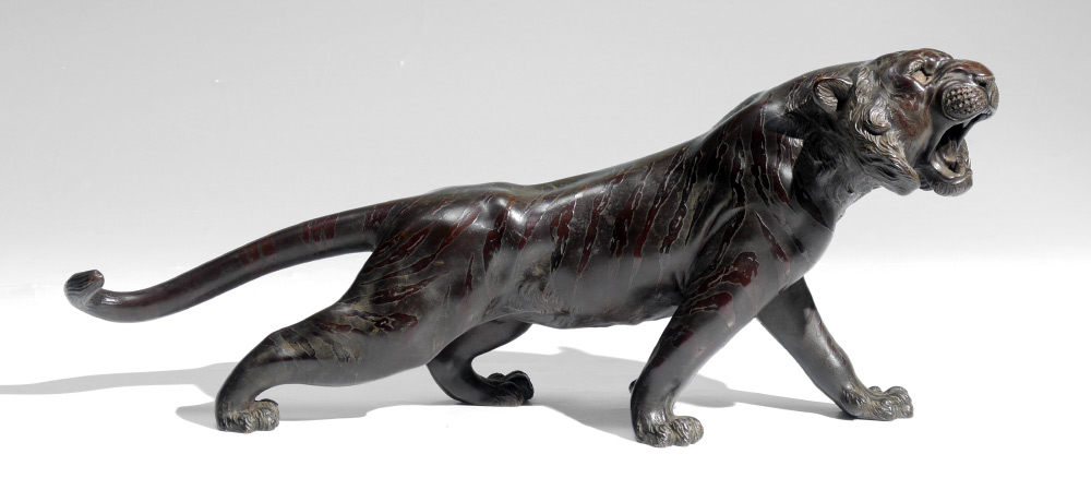 FINE JAPANESE BRONZE ROARING TIGER: 9 1/2'' H., 21'' L, Signed underneath, original patina, fine sharp casting.