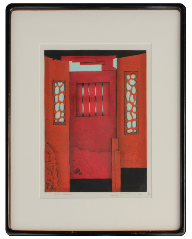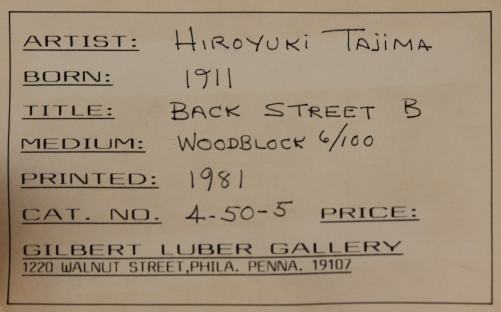 TAJIMA, Hiroyuki, (Japanese, 1911-1984): ''Backstreet B'', Japanese Woodblock, sight size 14'' x 10 1/2'', pencil signed lower right, dated 81', numbered 6/100, titled lower left, framed, 21'' x 17'', Gallery label affixed verso.