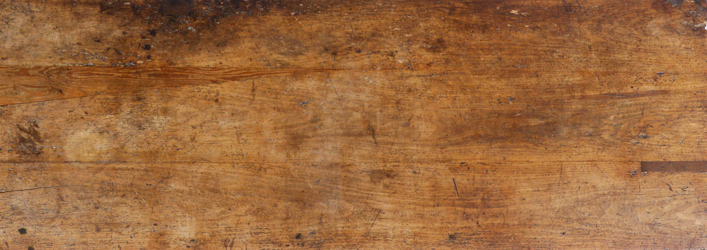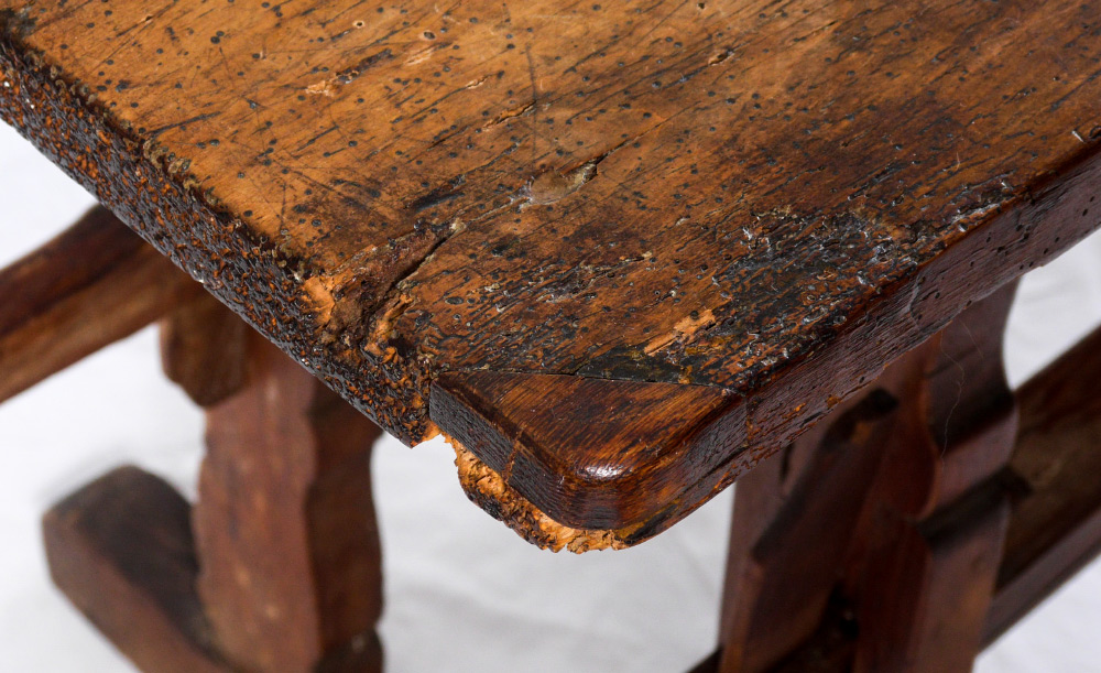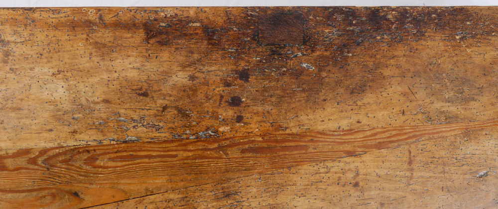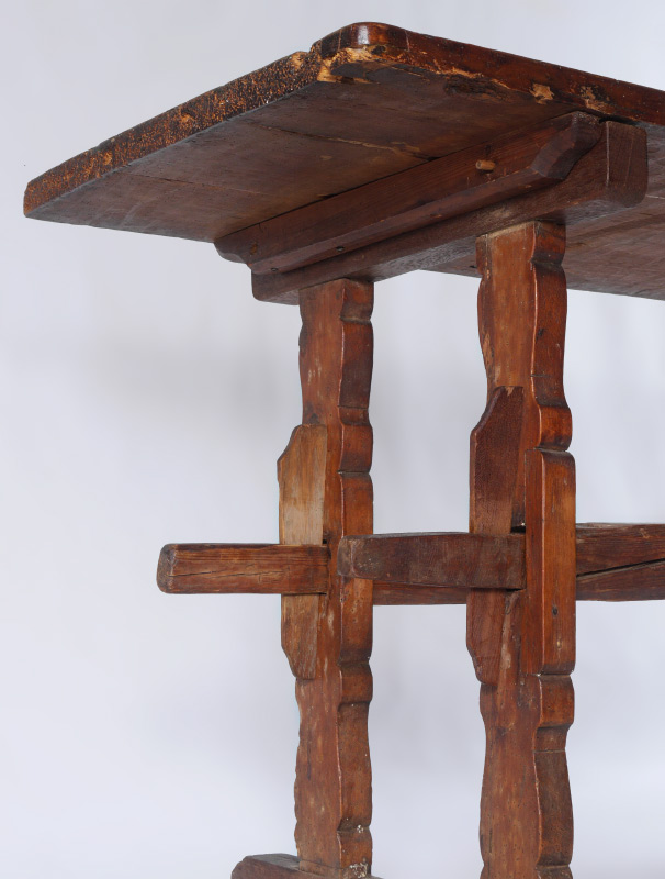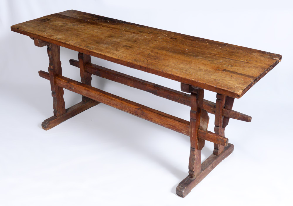EARLY EUROPEAN TRESTLE TABLE: Planked wood top, shaped supports with through tenon construction, overall measures 29 3/4'' h. x 68 1/2'' x 23 1/2''.