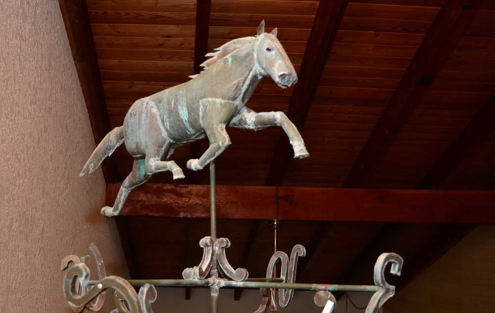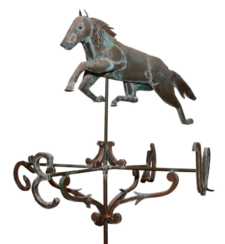 COPPER FULL BODY HORSE WEATHER VANE: Late 20th century construction from upper New York artist with nice weathered eye appeal. Horse overall measures 13 1/2'' h. x 32 1/2'' x 6''. Sold with directional pole, overall measures 70'' long x 32 1/2'' dia.