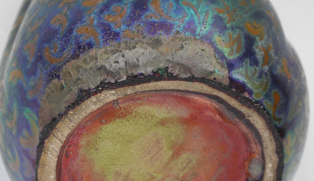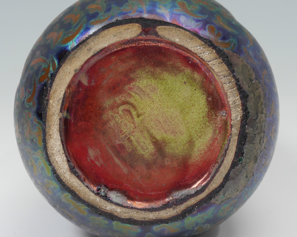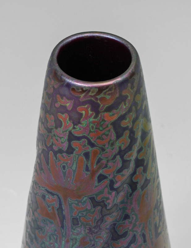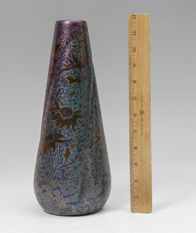 WELLER SICARD TAPERED TWIST VASE: Tapered form with slight twist, floral metallic pattern decoration, marked 22 on base. Measures 11 3/4'' x 4 3/4''.