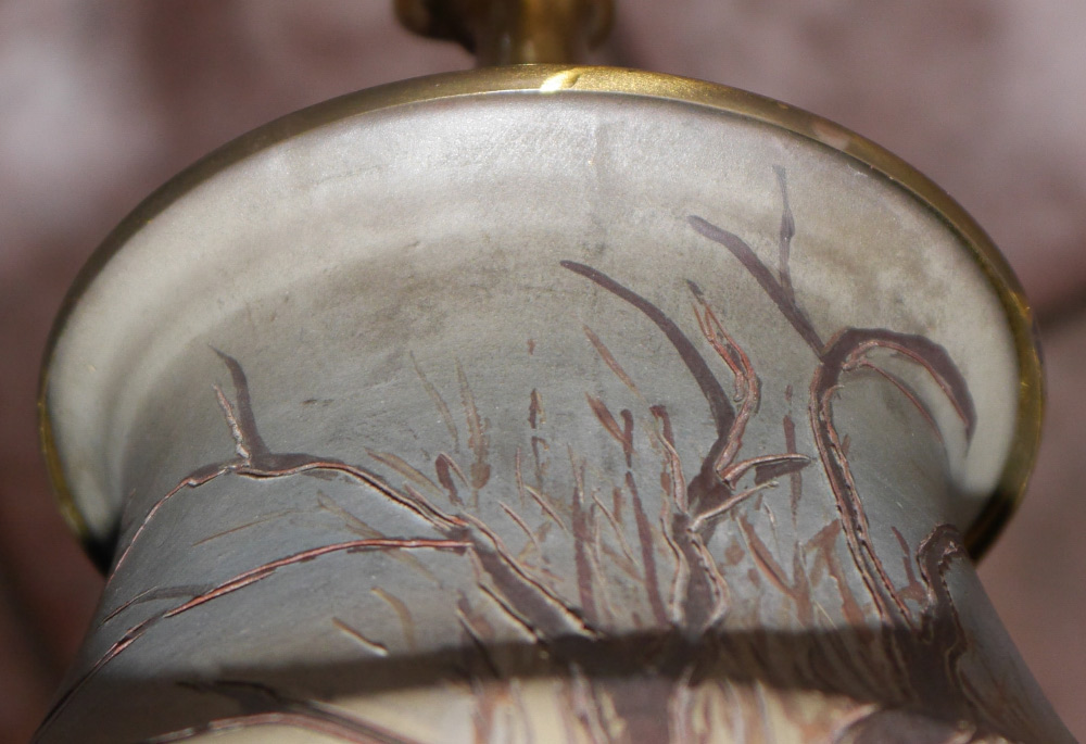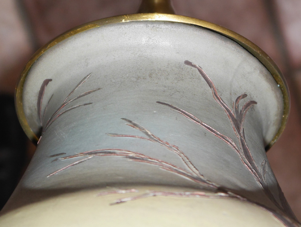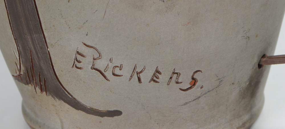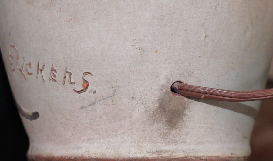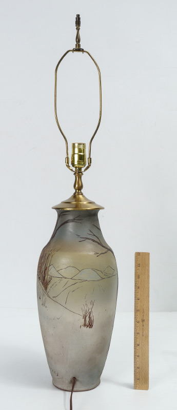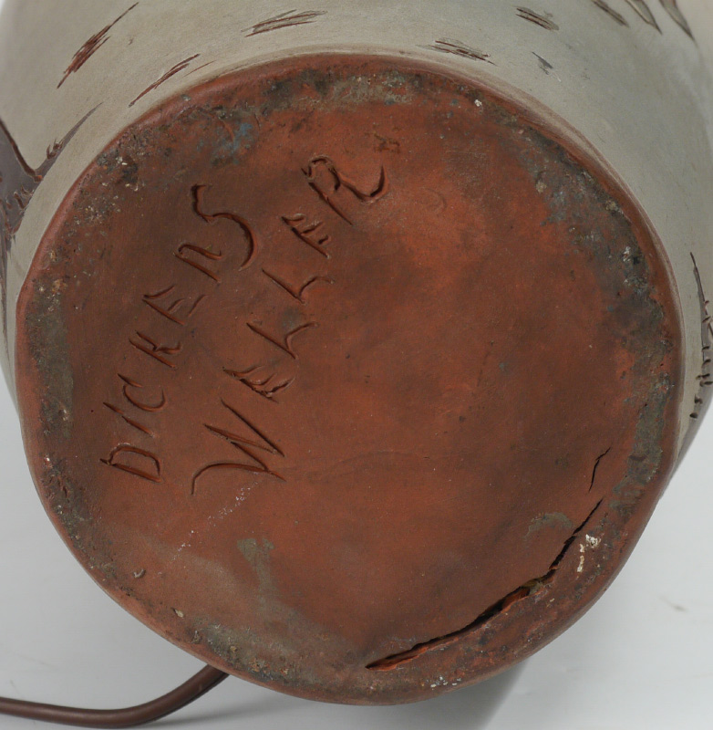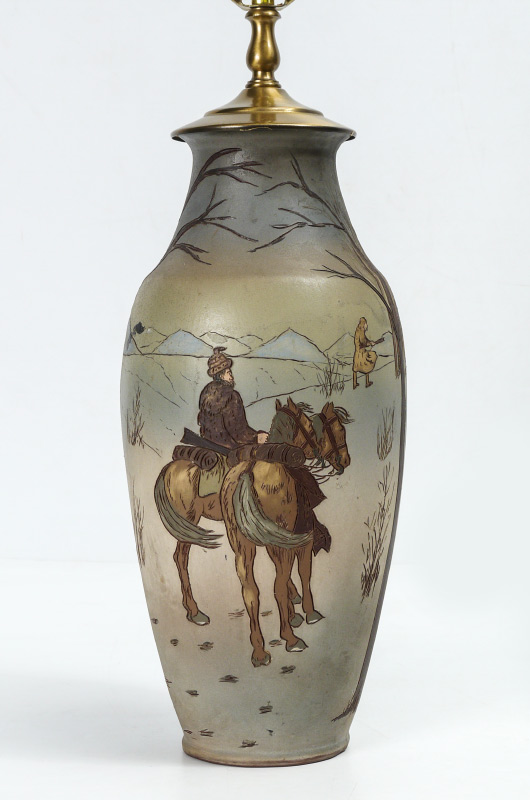 WELLER DICKENS WARE LAMP: Incised and decorated with scene of hunters in a field, incised signature near base E. Rickers. Drilled on side for lamp cored, incised Dickens and Weller on base. Overall measures 33'' h. x 7 1/4'', 21 1/2'' to top of socket. Sold with a heavy paper and cloth shade, 19'' x 17 1/2''.