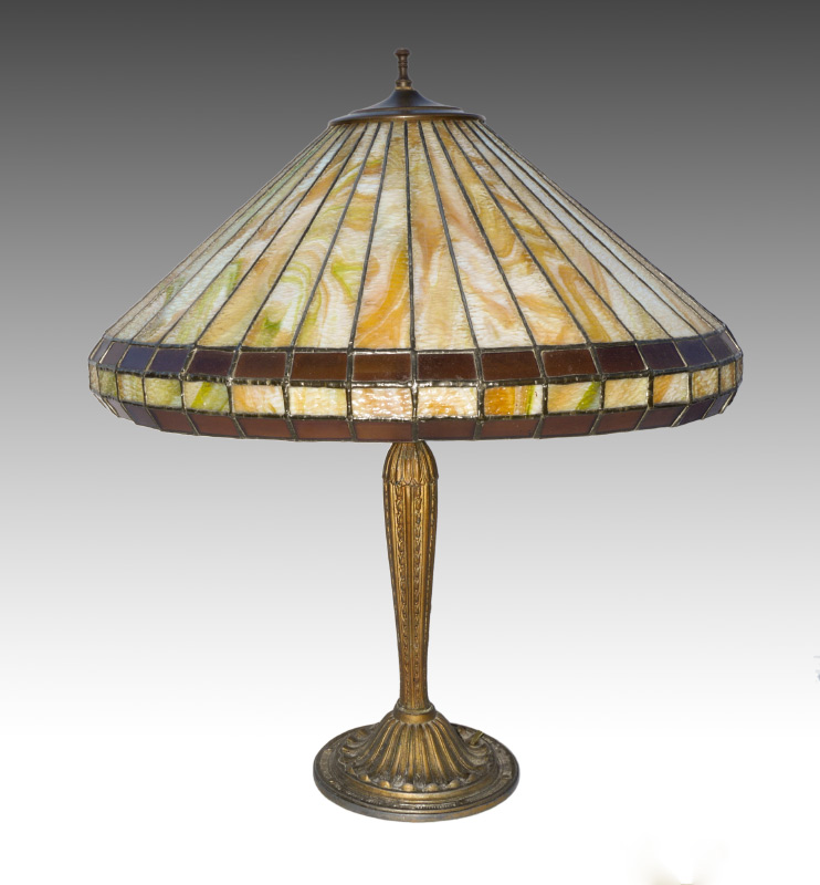 SLAG GLASS TABLE LAMP: Heavy gilt metal base, double socket fixture. Shade with 40 radiating panels from center over triple border. Base 23 1/4'' h. x 7'', shade 9 1/4'' x 21''.