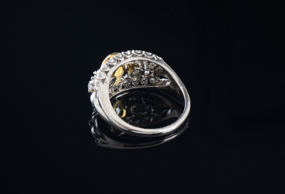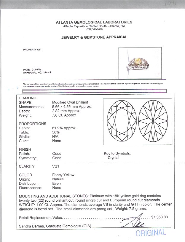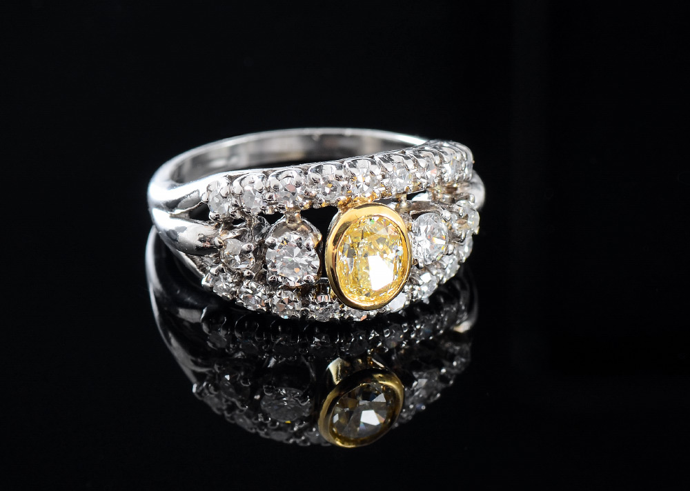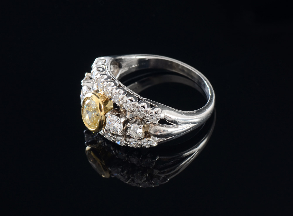 PLATINUM FANCY YELLOW DIAMOND RING: Retro 1950's ring centering an oval natural yellow diamond, .58 Ct. An additional 22 round brilliant, single cut and European round cur diamonds total approx. 1.00 Ct., averaging VS in clarity and G-H color. The yellow diamond is bezel set in 18K yellow gold. Size 6. Weight 7.5 grams. Sold with current Atlanta Gemological GIA graduate's appraisal for $7,350.