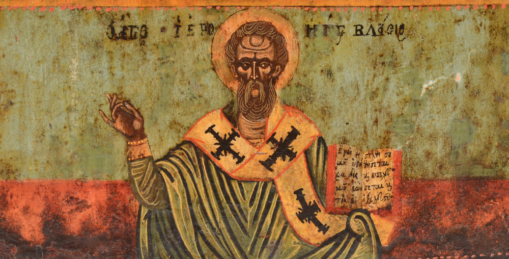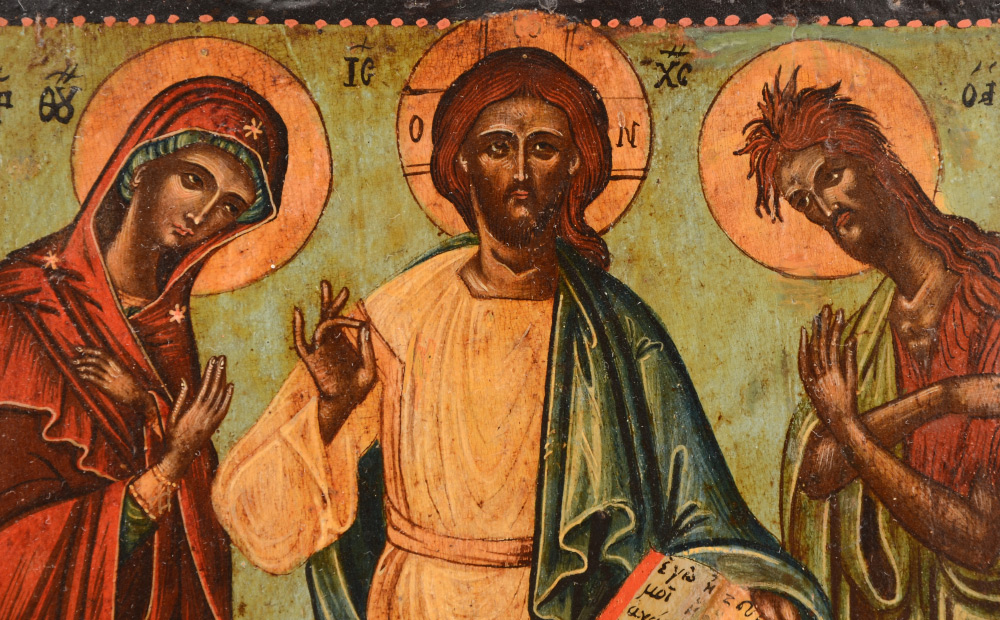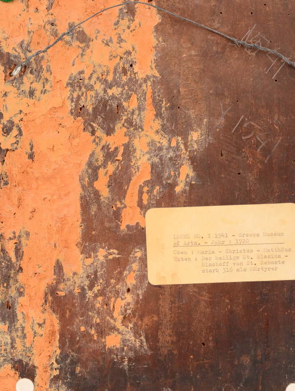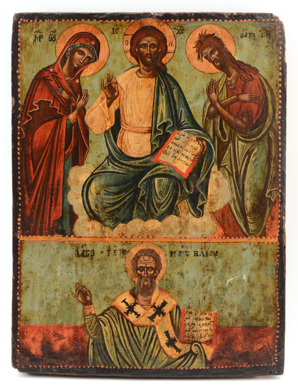 18TH? C. GREEK ICON: Christ, Mary and St. Matthew in the upper portion, St. Sebastian in the lower, 11 3/4'' x 8 1/4'', early museum label affixed verso, unframed.