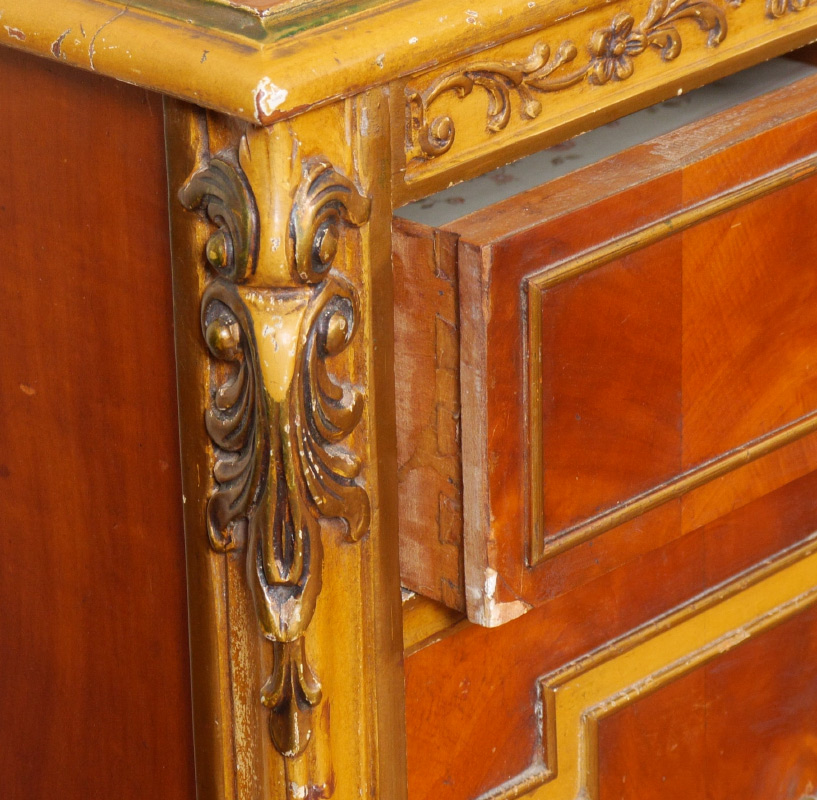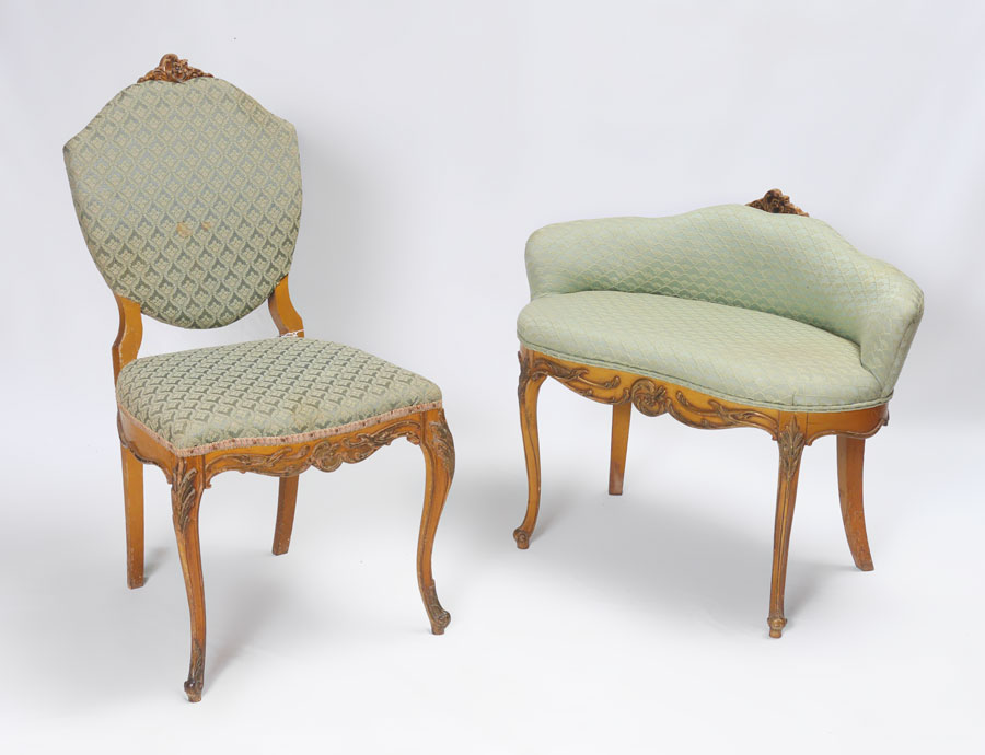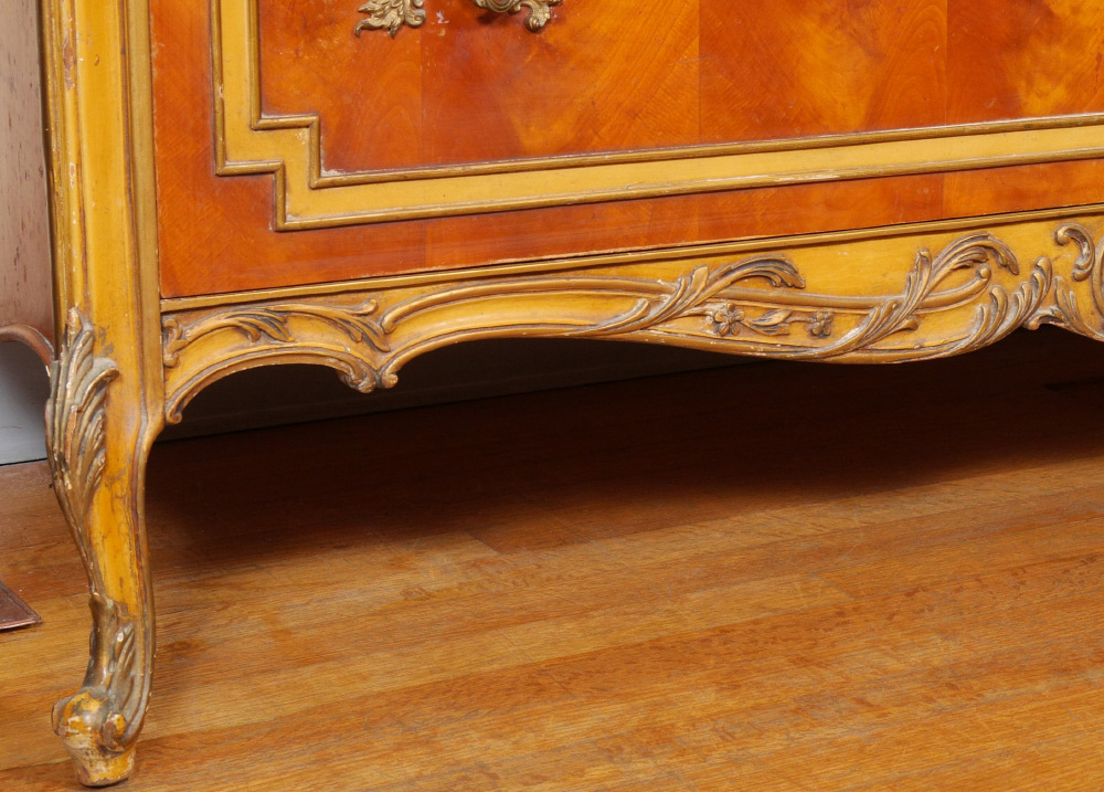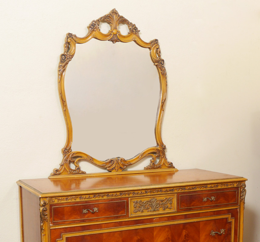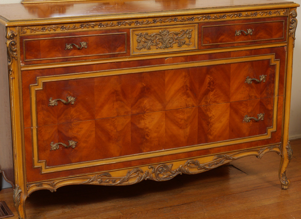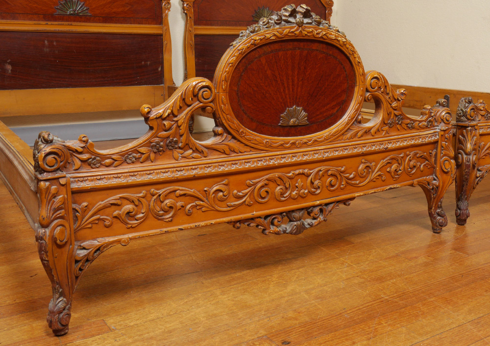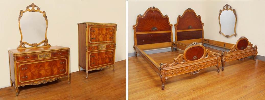 6 PIECE CARVED FRENCH BEDROOM SUITE: An assembled 6 piece collection to include 2 twin BEDS with parquetry veneer and carved trim (headboards 30 3/4'' h. x 45'' x 2''), 5 drawer tall CHEST (54 1/2 h. x 37'' x 21 1/2''), 3 drawer DRESSER with mirror (78'' h. x 52'' x 22''), wall MIRROR (42'' x 28 1/2'' x 1 1/2''), uphostered side CHAIR (36 1/2'' h. x 19 1/2'' x 21'')