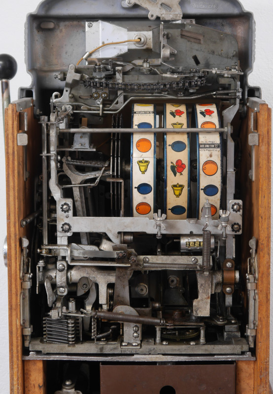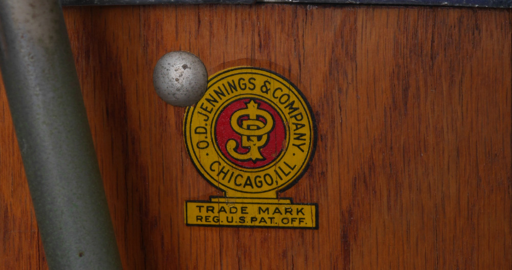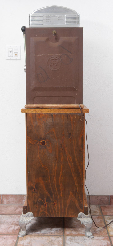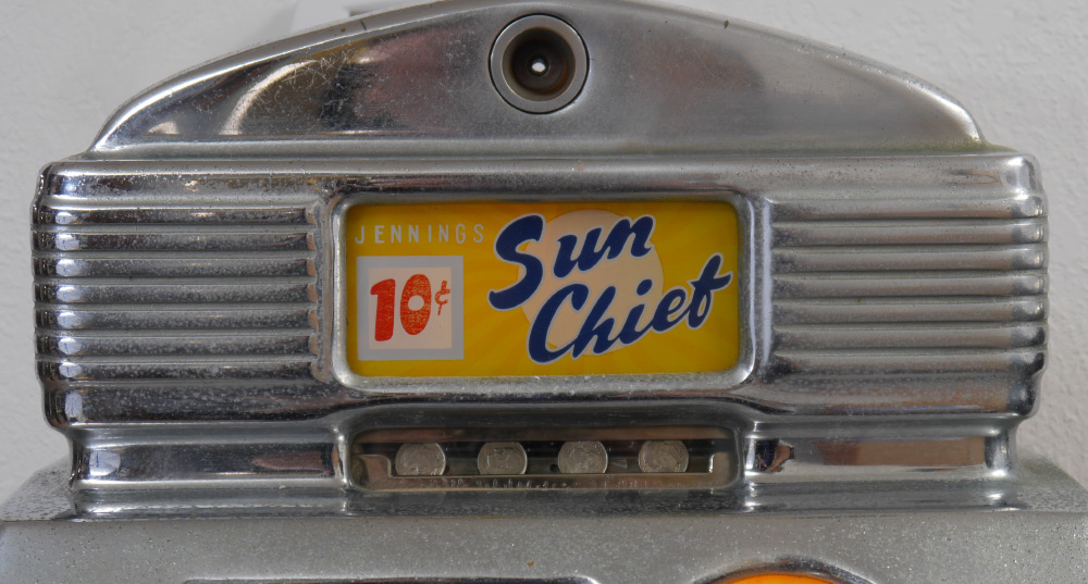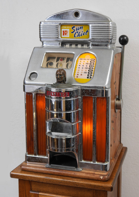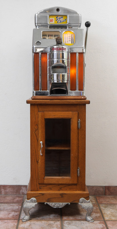 JENNINGS SUN CHIEF 10 CENT SLOT MACHINE: Chrome top with yellow background Sun Chief inserts, 3 reels, amber catalin illuminated front panels, original Jennings labels either side of oak case. Measures 27 1/4'' h. x 17'' x 17 1/4''. Sold with a contemporary stand with single glass door, shaped cast metal feet. Strand 34 1/4'' x 20'' x 19 1/2''.