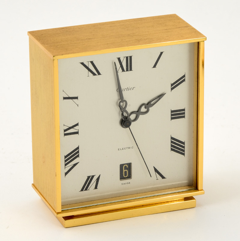 CARTIER ELECTRIC CALENDAR DESK CLOCK BY CONCORD: Swiss made for Cartier by the Concord Watch Company. Visible calendar and Roman numeral dial. 4'' x 3 3/4'' x 2''.