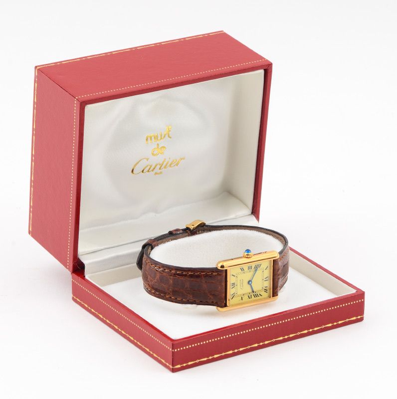MUST DE CARTIER TANK WATCH: Vermeil gold over sterling silver, original strap and buckle. Quartz movement. Sold with box and pamphlets. Length 10''. Suitable for man or lady.