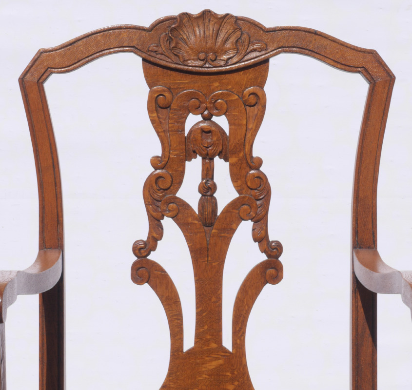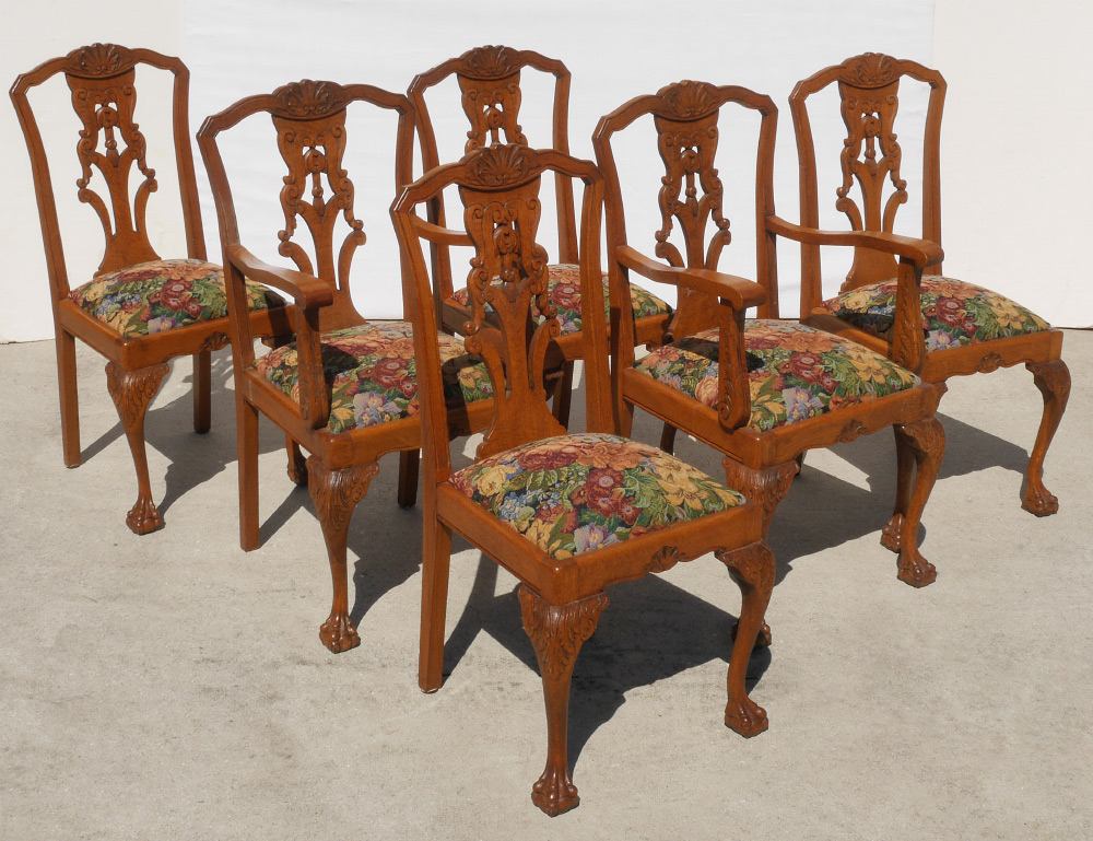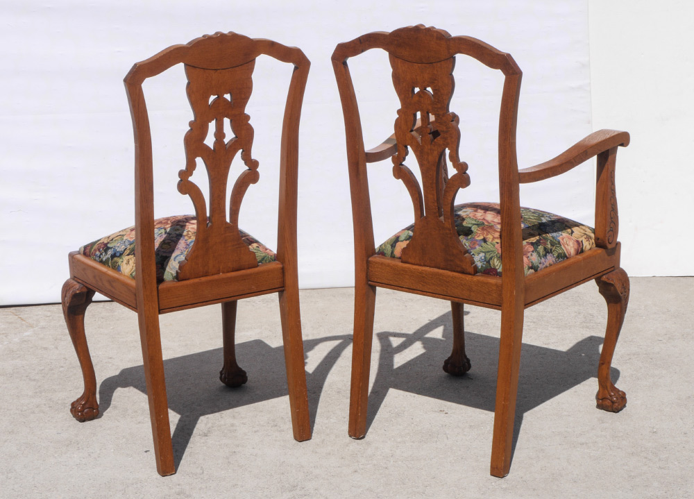 SET OF 6 CARVED GOLDEN OAK DINING CHAIRS: Country French style, carved shell top rail, ball and claw feet. S arm chairs (40''h x 21'' x 18') and 4 side chairs.