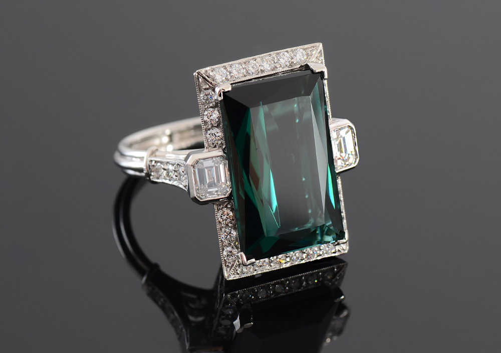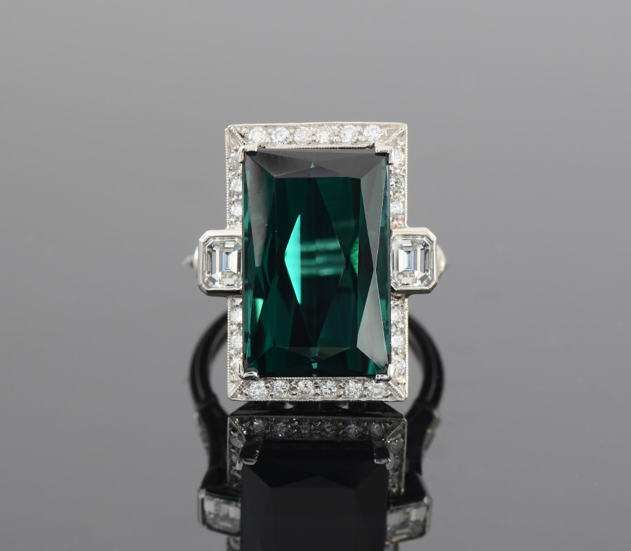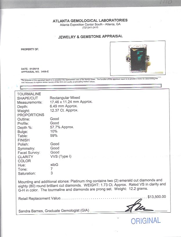 PLATINUM 12.37 CT TOURMALINE RING WITH DIAMONDS: At the center of this power ring is a 12 .37 Ct rectangular mixed cut dark green tourmaline of VVS clarity, measures 11.24 mm x 17.46 mm. Signed Dino, this hand fabricated ring also has diamonds totaling approx. 1.73 Ct., of VS clarity and G-H color. Stones are prong set. Size 6 1/2. Weight 12.2 grams. Sold with current Atlanta Gemological GIA graduate's appraisal for $13,500.
