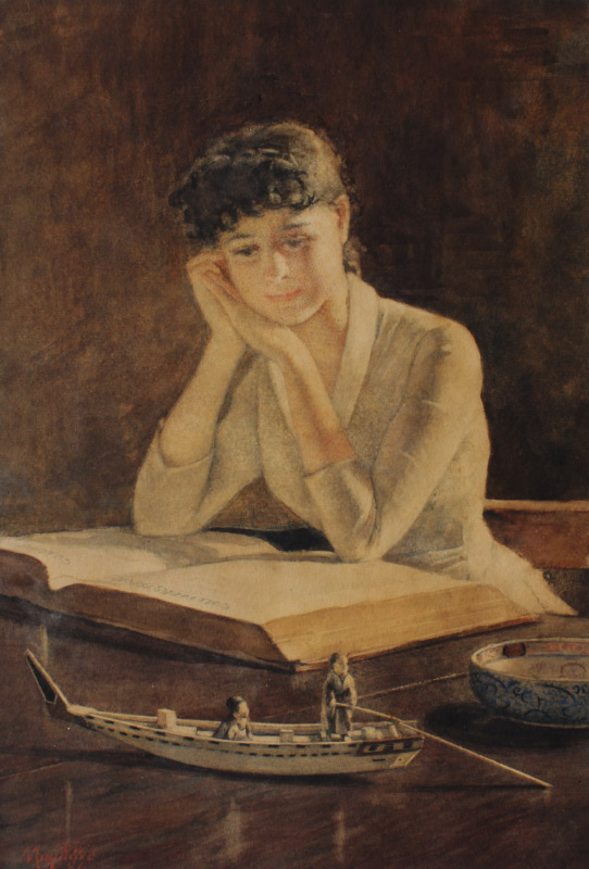 MAYNARD, George Willoughby, (American, 1843-1923): Young Girl at Desk with Oriental Sculpture and Porcelain Bowl, She is Reading Gulliver's Travels, Watercolor, 15 1/2'' x 11'', signed lower left, gilded frame, 25 1/2'' x 22''. Accompanying paperwork with Sotheby's estimate from 1989 for 1500/3000.