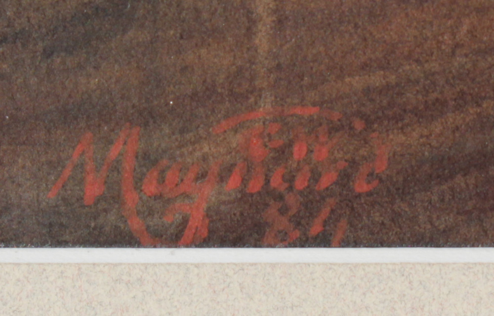 CONDITION: Frame has been painted, and shows loss and wear, watercolor on paper is hinge mounted. several dark spots in margins, abrasion near right side of her head, sold as is.