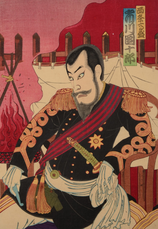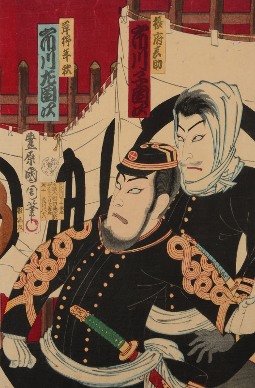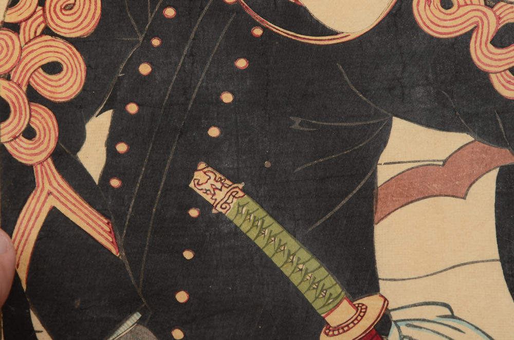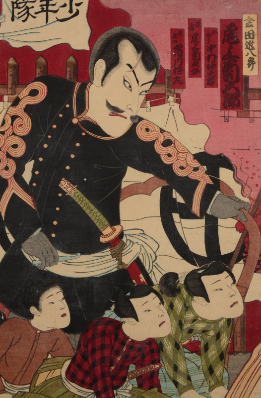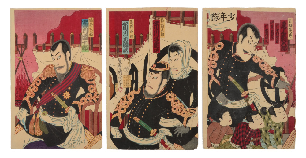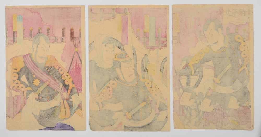 KUNICHIKA MILITARY JAPANESE WOODBLOCK TRIPTYCH: With Children, 14'' x 10'' each page, unframed.
