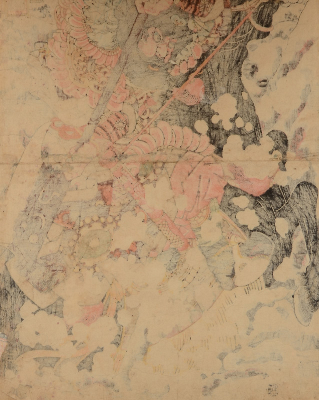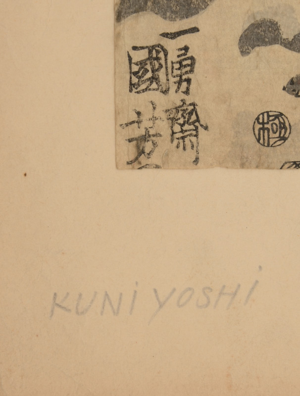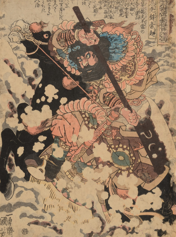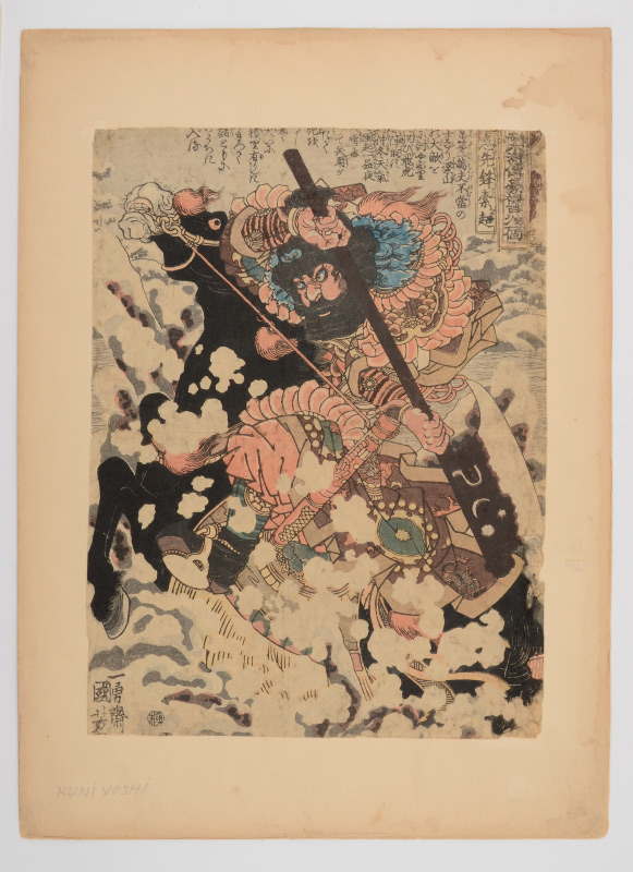KUNIYOSHI JAPANESE WOODBLOCK OF SAMURAI ON HORSEBACK: 13 1/2'' x 9 7/8'', unframed.