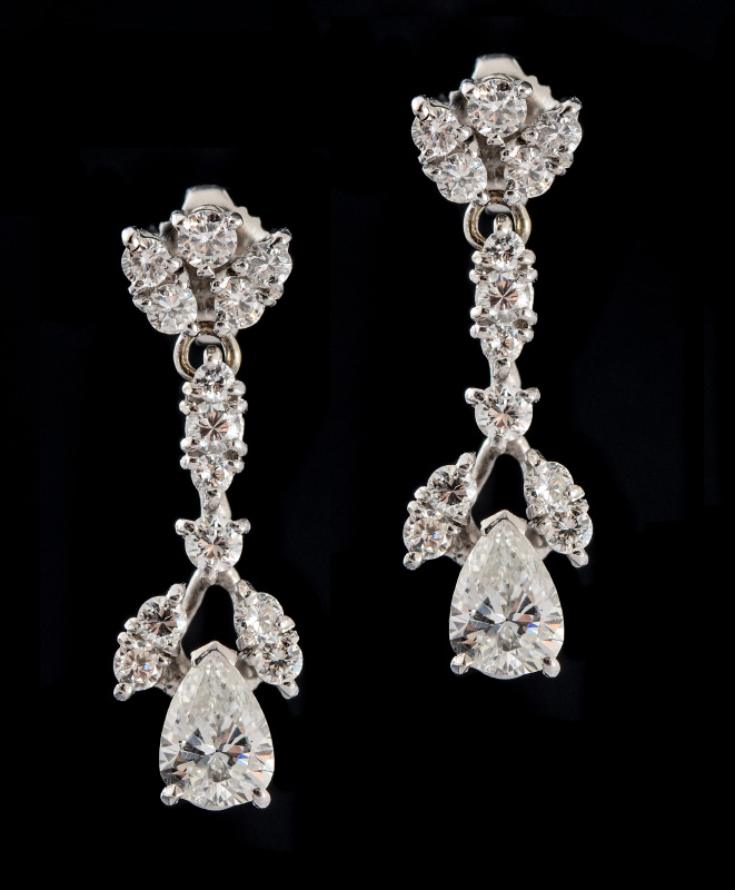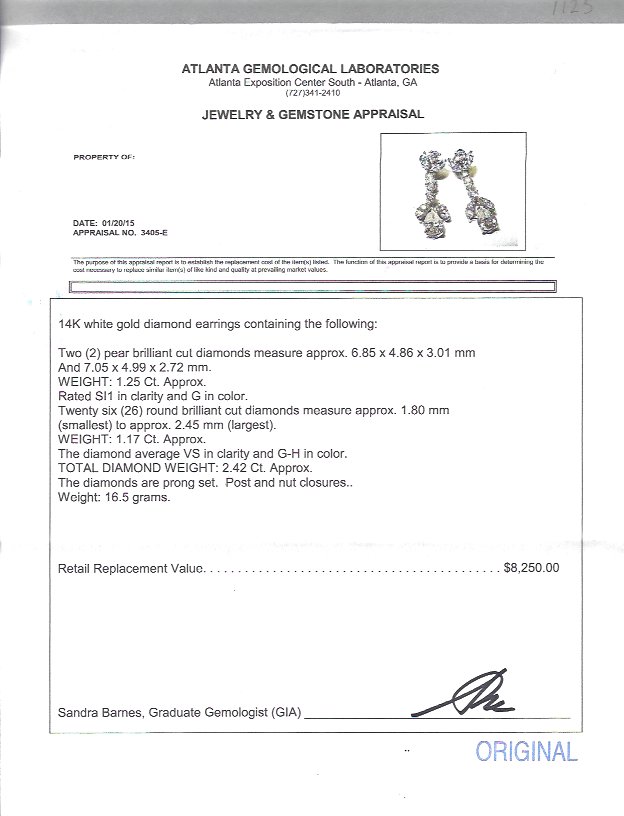 DIAMOND CHANDELIER EARRINGS: 14K white gold mini chandelier style earrings with 2 pear brilliant and 26 round brilliant diamonds totaling approx. 2.42 Ct. Clarity ranges from SI1-VS, color G-H. Length 1''. Weight 16.5 grams. Sold with current Atlanta Gemological GIA graduate's appraisal for $8,250.