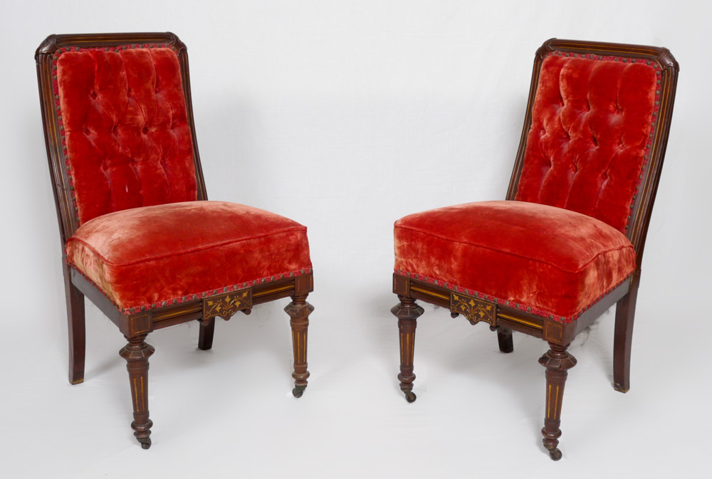 PAIR OF EASTLAKE SIDE CHAIRS: Carved and shaped frames with gilt paint highlights, carved and turned front legs ending in castors. Plush red upholstery with tufted back. 36 1/4'' h. x 20 1/2'' x 25''.