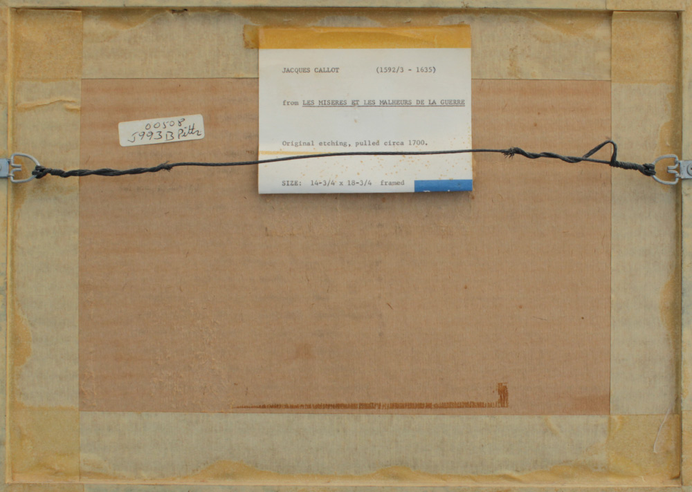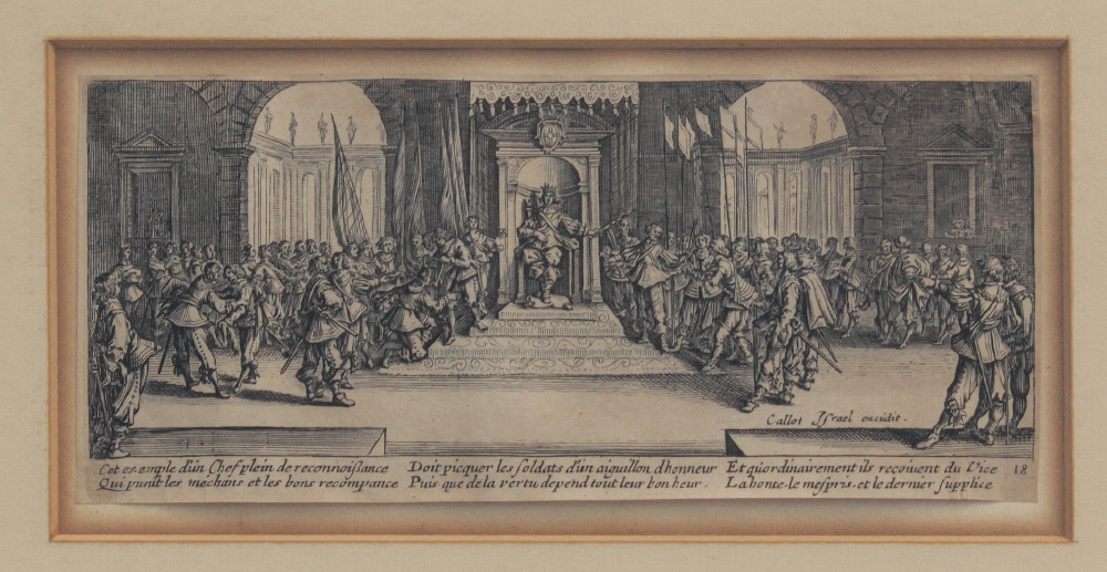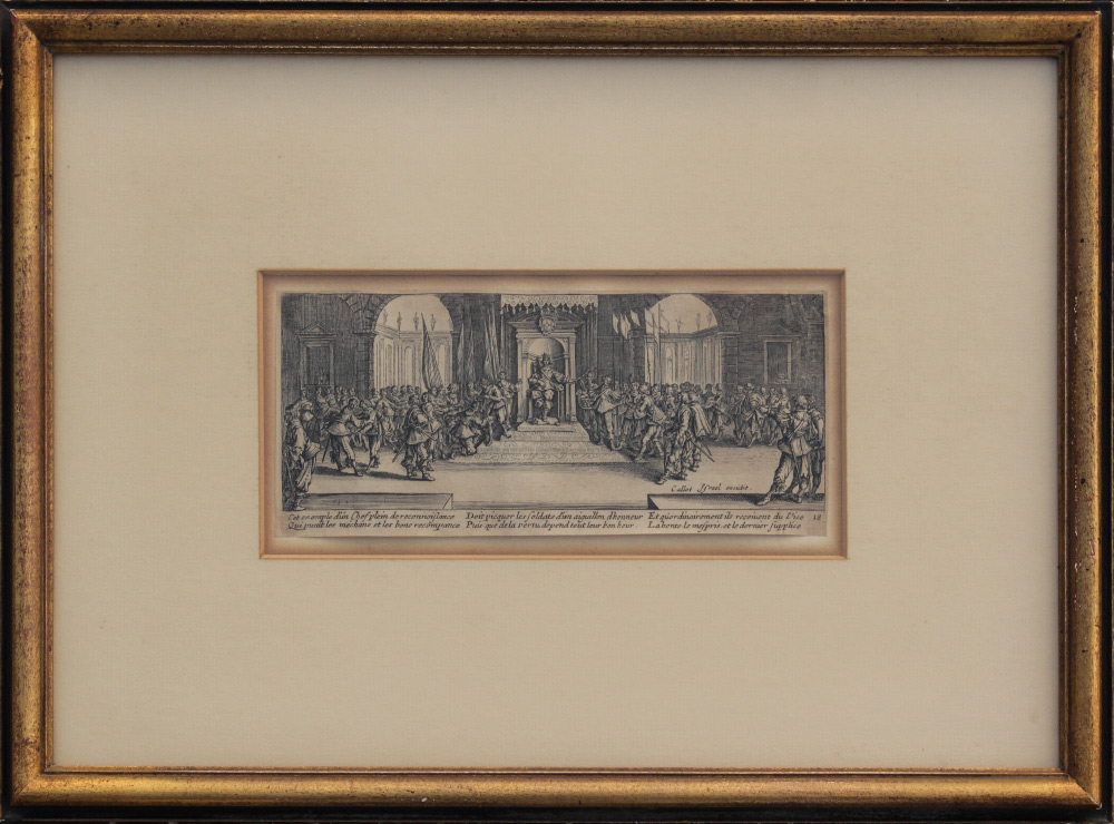 CALLOT ETCHING FROM LES MISERES ET LES MALHEURS DE LA GUERRE: Distribution of rewards, from the suite The Miseries and Misfortunes of War, according to the original Barclay Gallery label verso, this was pulled in 1700, 3 1/4'' x 17 1/2'', framed, 11'' x 15''.