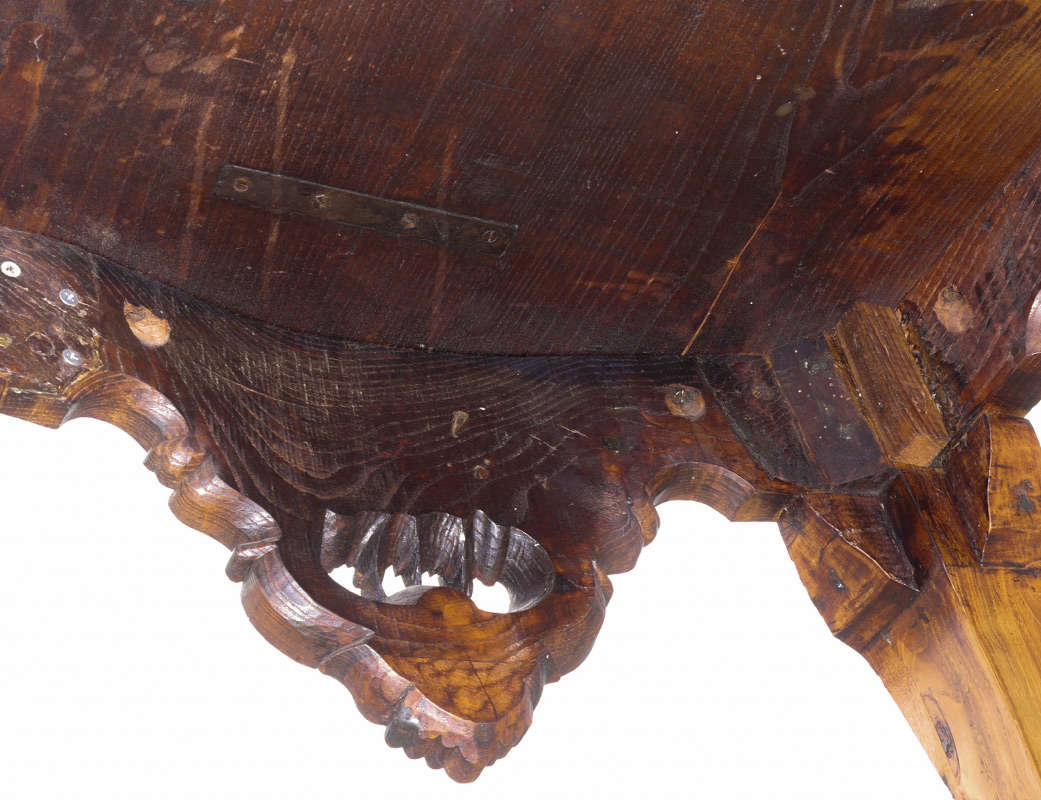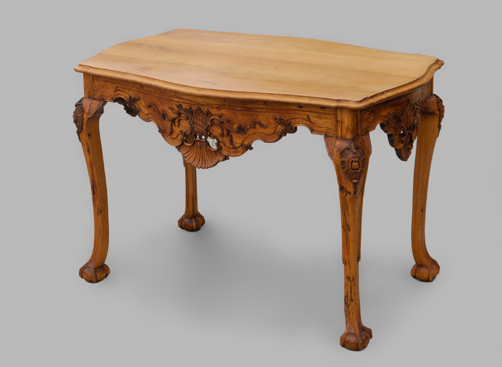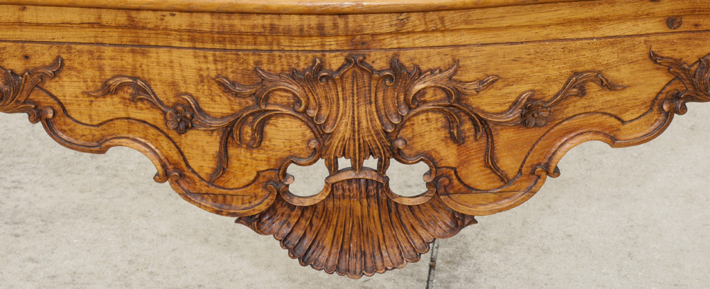 CARVED COUNTRY FRENCH WALNUT WRITING TABLE: Beveled shaped top over carved skirt, cabriole legs ending in ball and claw feet. Original finish has been removed. Measures approx. 32'' tall x 46 1/2'' x 30''.