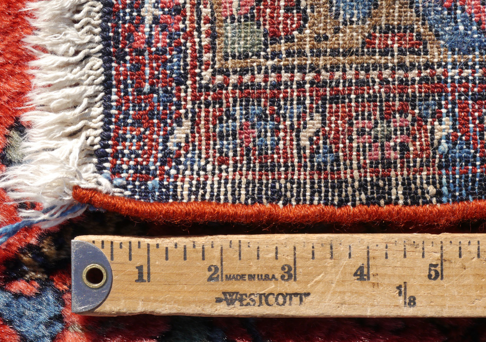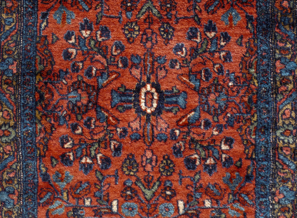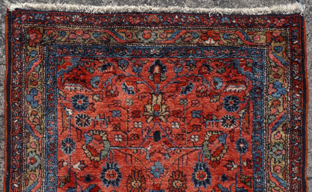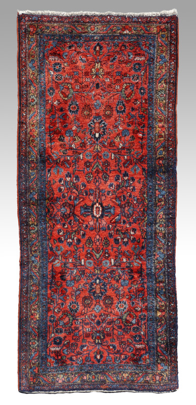 SEMI-ANTIQUE PERSIAN LILLIHAN HAND KNOTTED WOOL RUG, 2'7'' x 6'9'': This pretty, meaty rug has velvety shiny wool and a pattern like a traditional Sarouk would have on a salmon red field. The mainly blue borders have some color changes in them but this doesn't detract from the overall look of the rug. Condition is good.