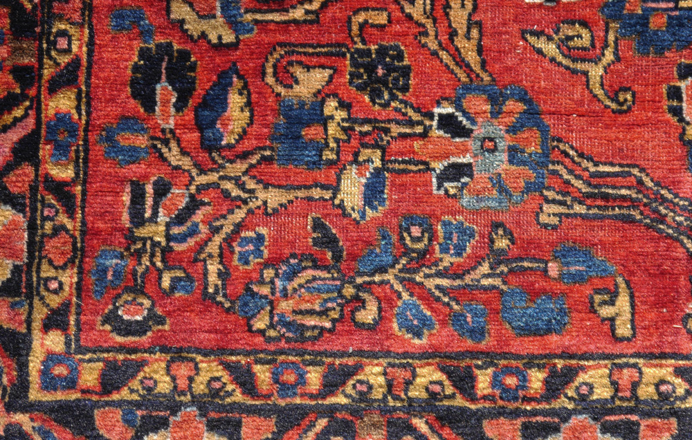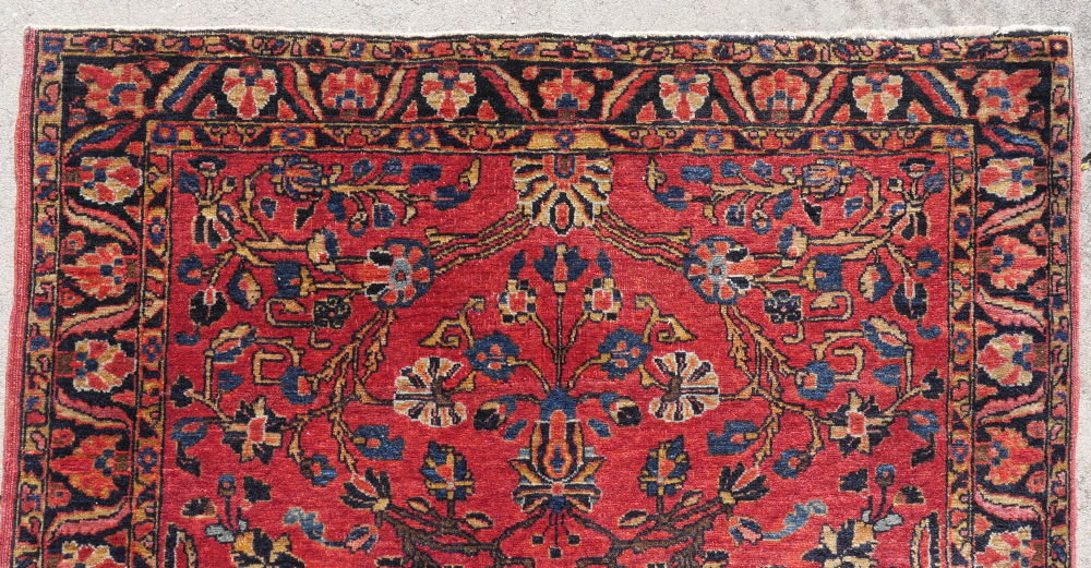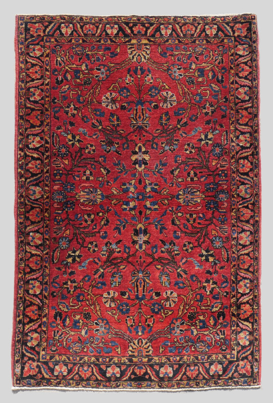 SEMI-ANTIQUE PERSIAN SAROUK HAND KNOTTED WOOL RUG, 3'5'' x 5': This lovely Persian Sarouk was woven in a traditional design and colors. The salmon red of the field is covered with branches of flowers, some grow from vases at the center of each end of the field and others are placed around the central small medallion that is in itself another spray of flowers and leaves. The midnight blue main border has a design of palmettes alternating with leaves.